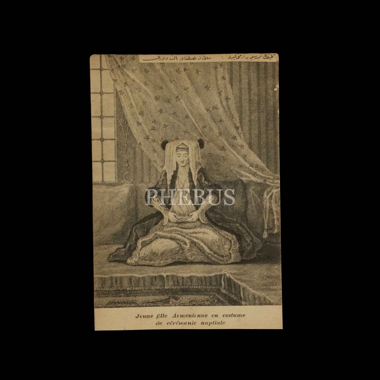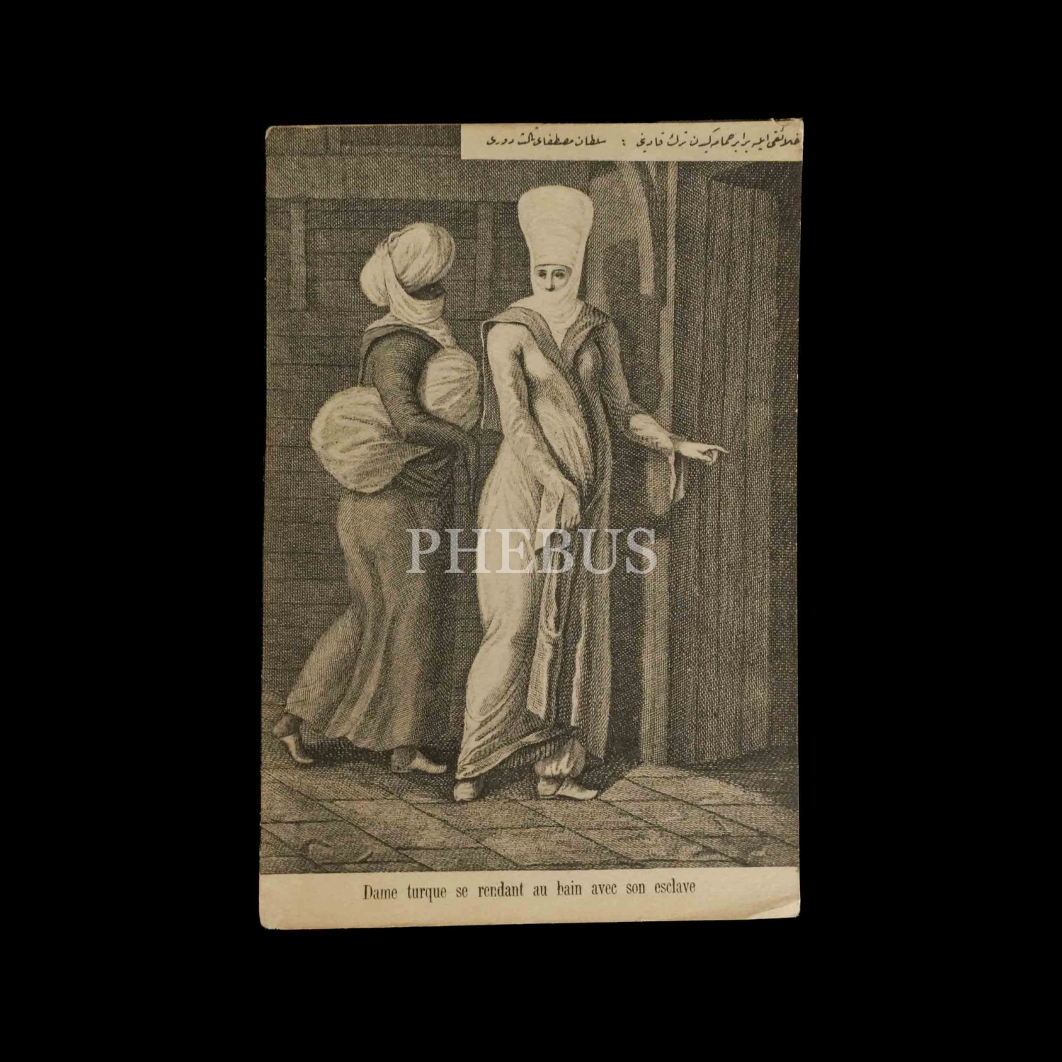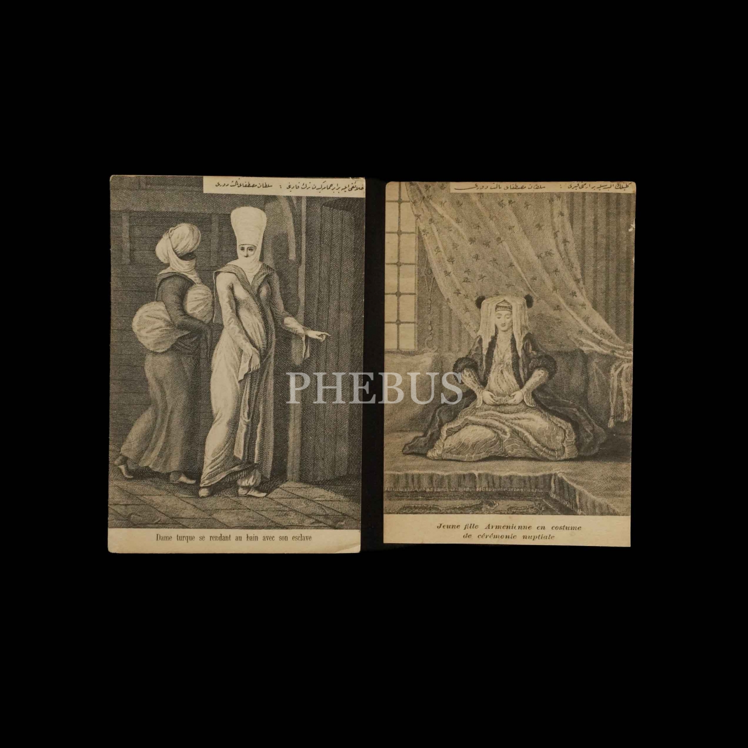 Sultan Üçüncü Mustafa döneminden halayıkıyla beraber hamama giden bir Türk kadını ve gelinlikli bir Ermeni kadının resmedildiği, Fransızca ve Osmanlıca açıklamalı iki adet kartpostal, 11x16 cm...