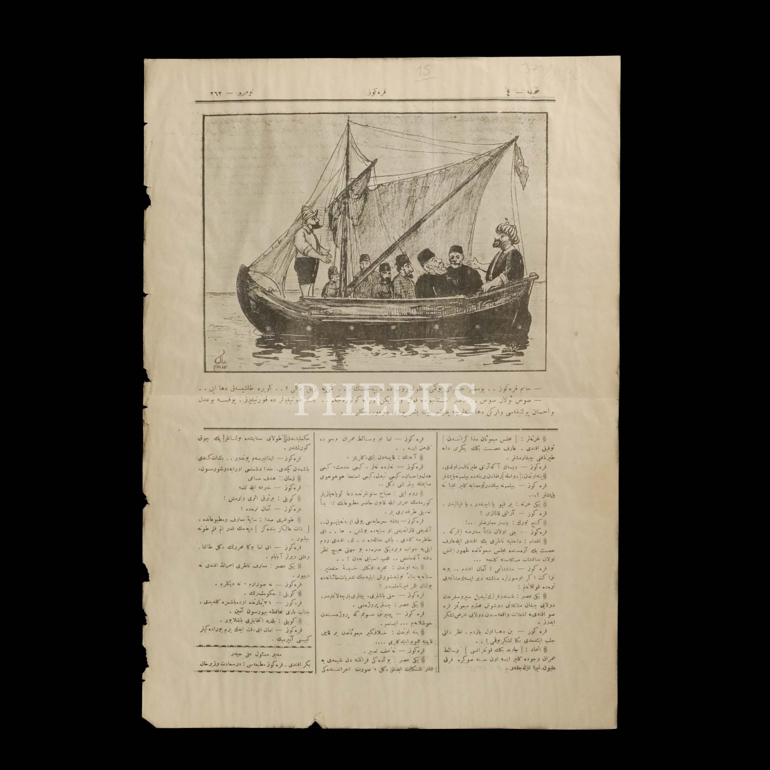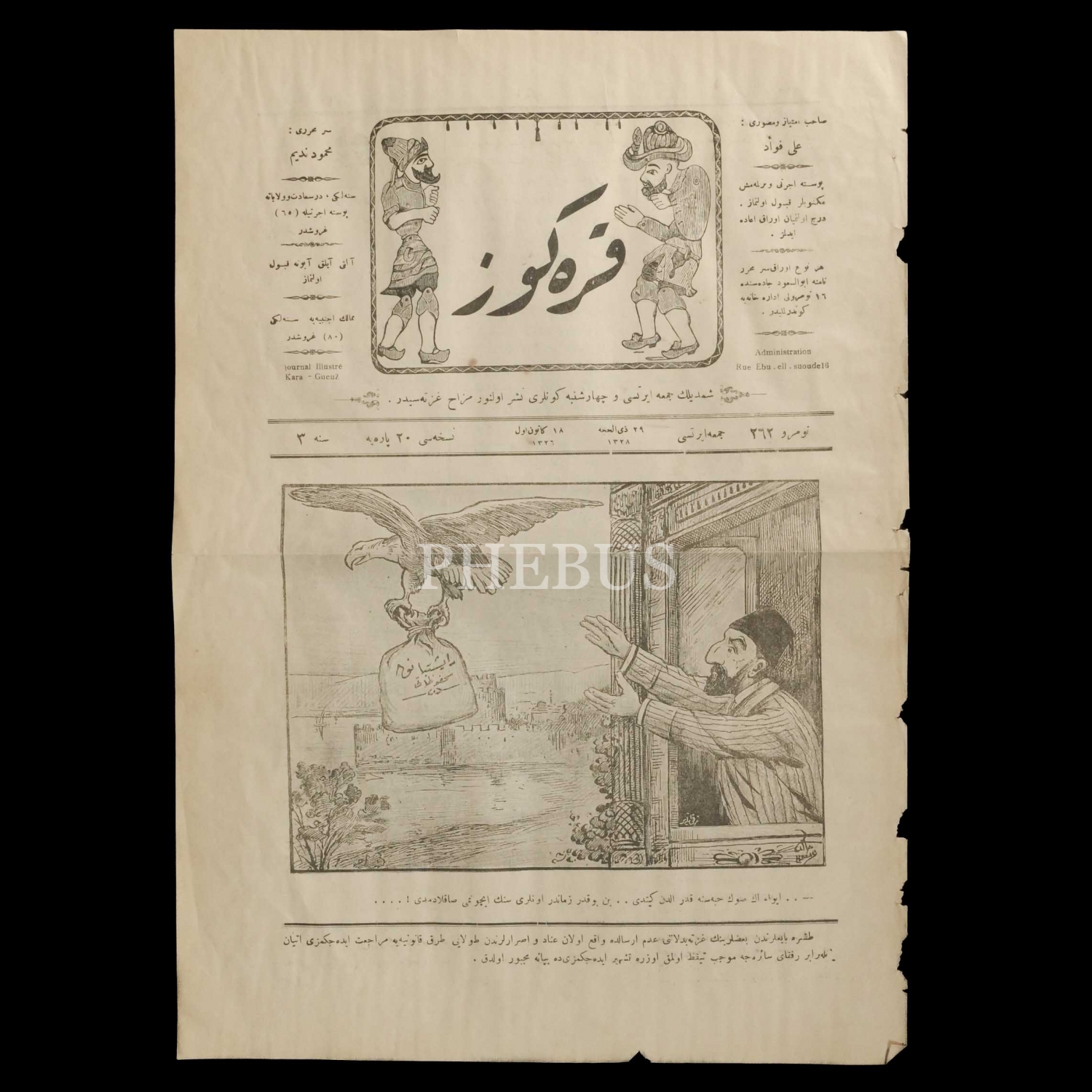 Sultan İkinci Abdülhamid´in tahtan indirilmesi üzerine Osmanlı Bankası´nda bulunan servetini "Deutsche Bank" hesabına aktarmasını konu alan kapağıyla KARAGÖZ dergisinin 18 Kanunievvel 1326 tarihli nüshası, 27x38 cm...