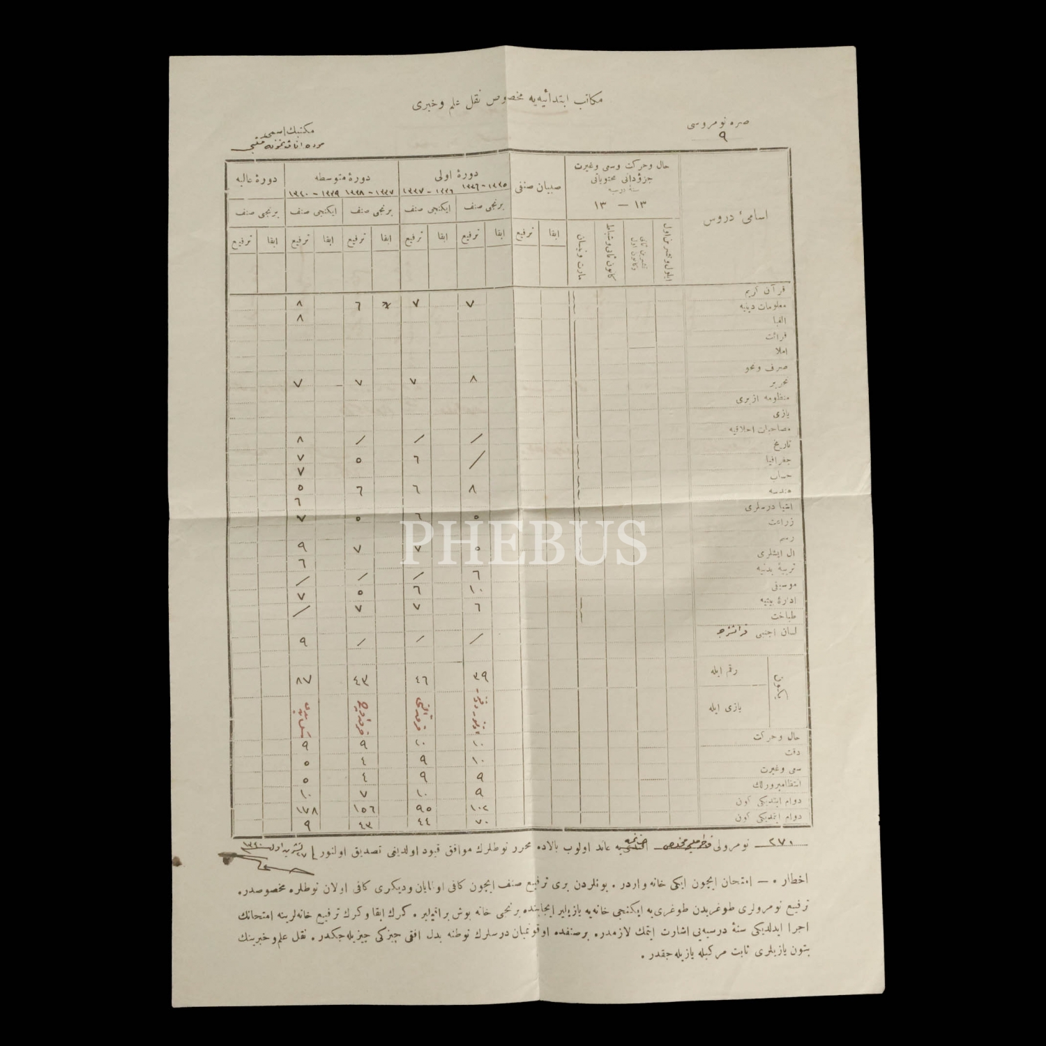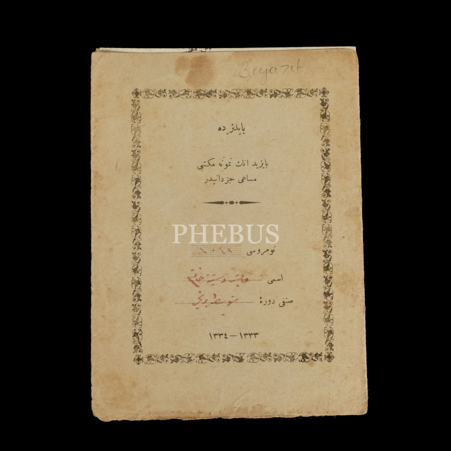 Beyazıt İnas Mektebi tarafından Ayşe Destina Hanım´a verilen karne, 1333-1334, 13x17 cm...