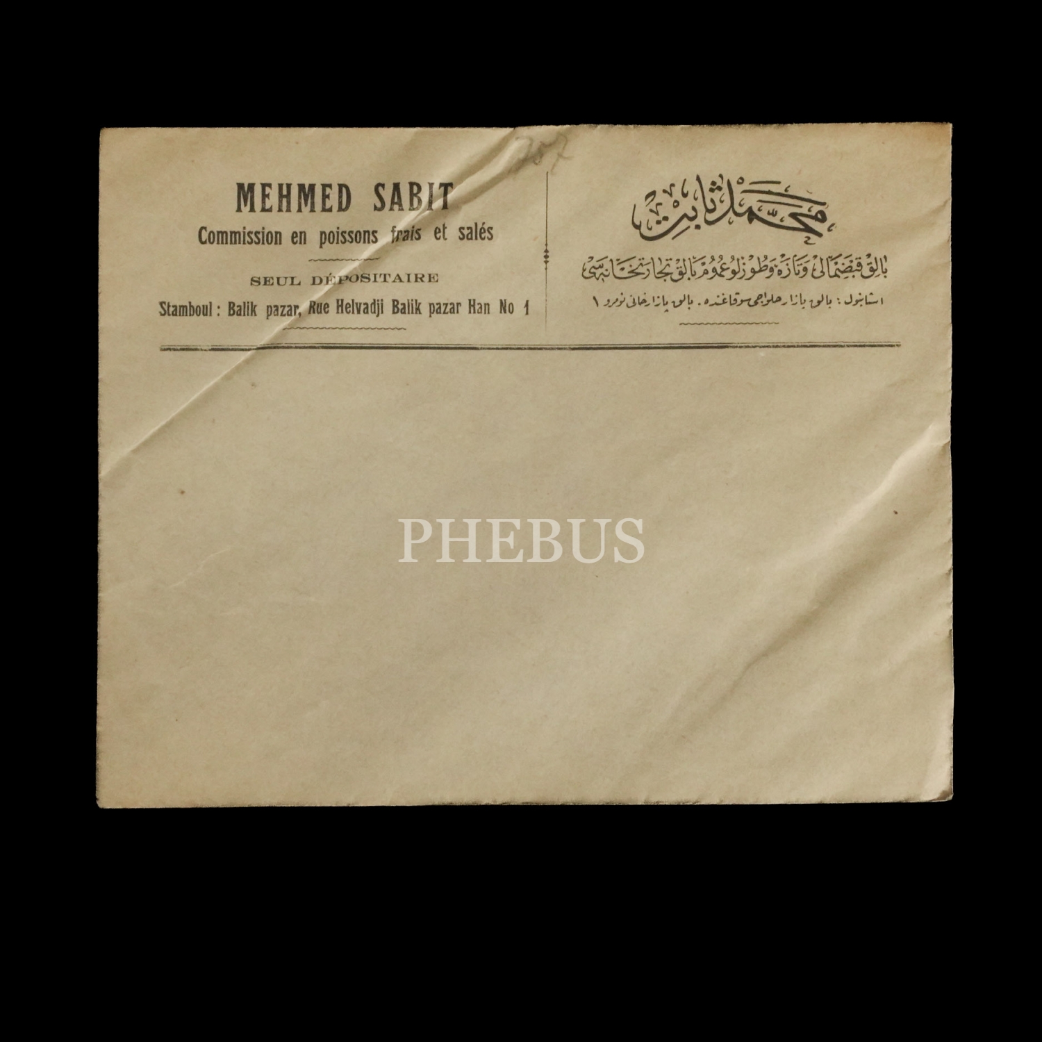 "Balık kabzımalı ve taze ve tuzlu umum balık ticarethanesi Mehmed Sabit" antetli, iki dilde mektup zarfı, 16x12 cm...