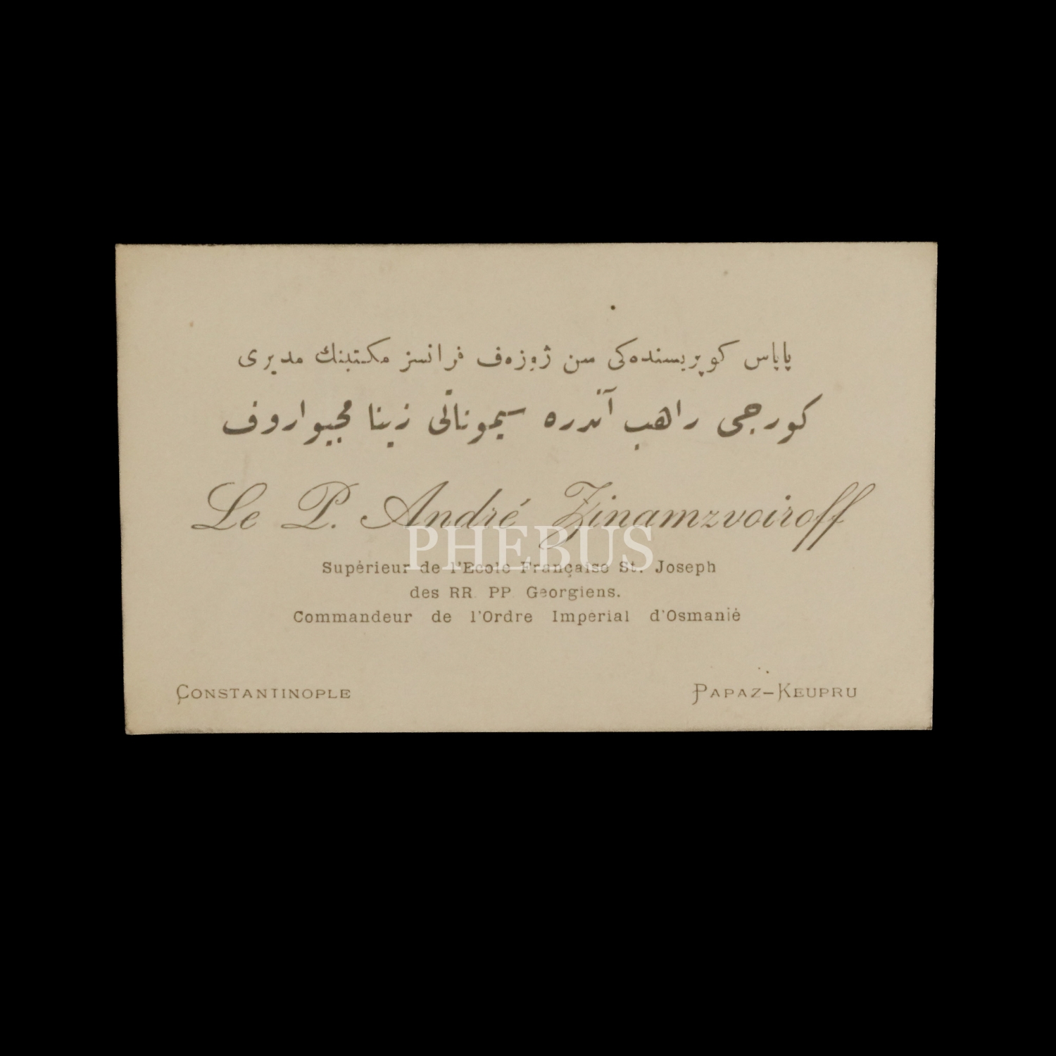 Saint-Joseph Fransız Lisesi Müdürü ve Gürcü Rahip Andre Zinamzvoiroff´un iki dilde kartviziti, 10x6 cm...