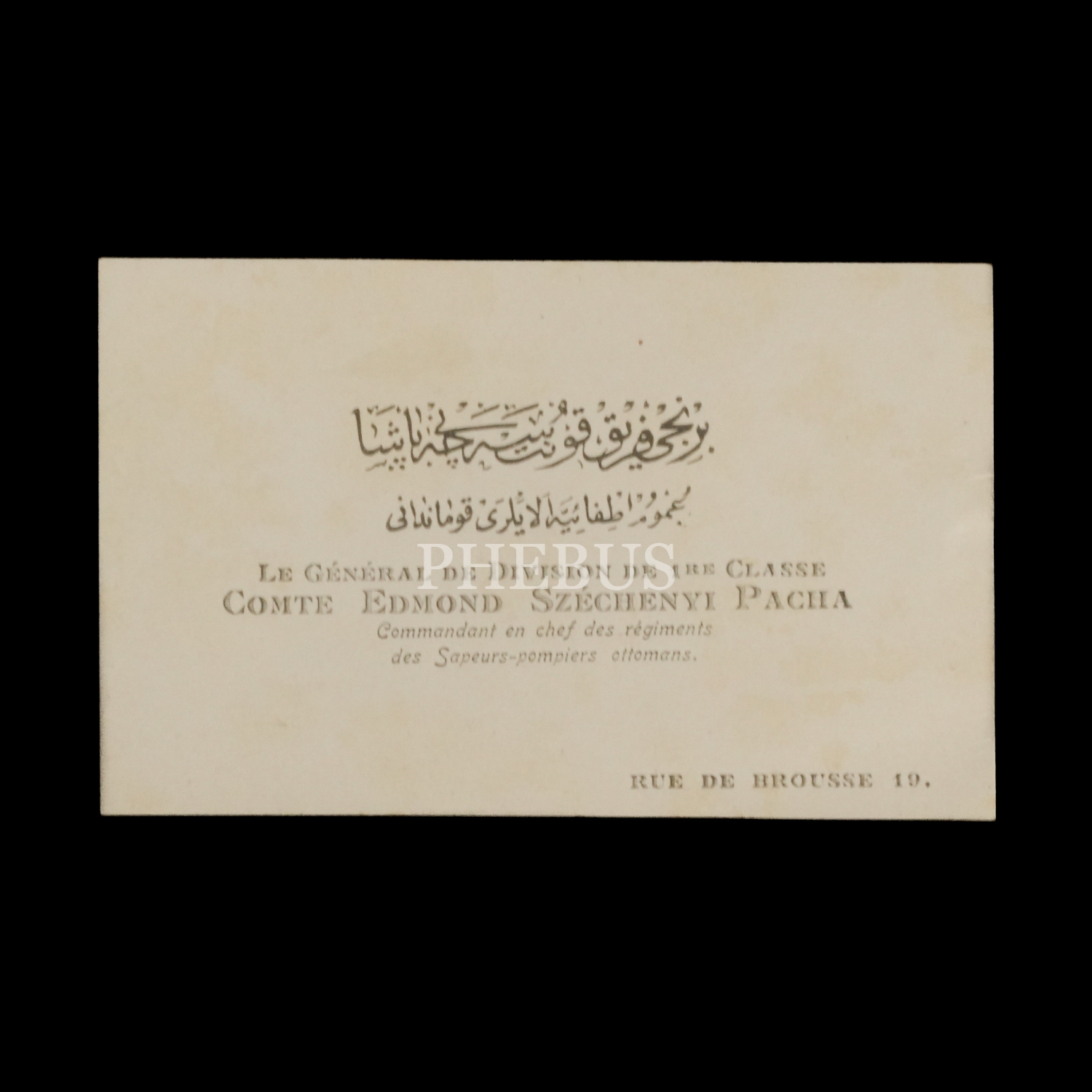 Umum İtfaiye Alayları Kumandanı Birinci Ferik Szechenyi Paşa´nın iki dilde kartviziti, 10x7 cm...