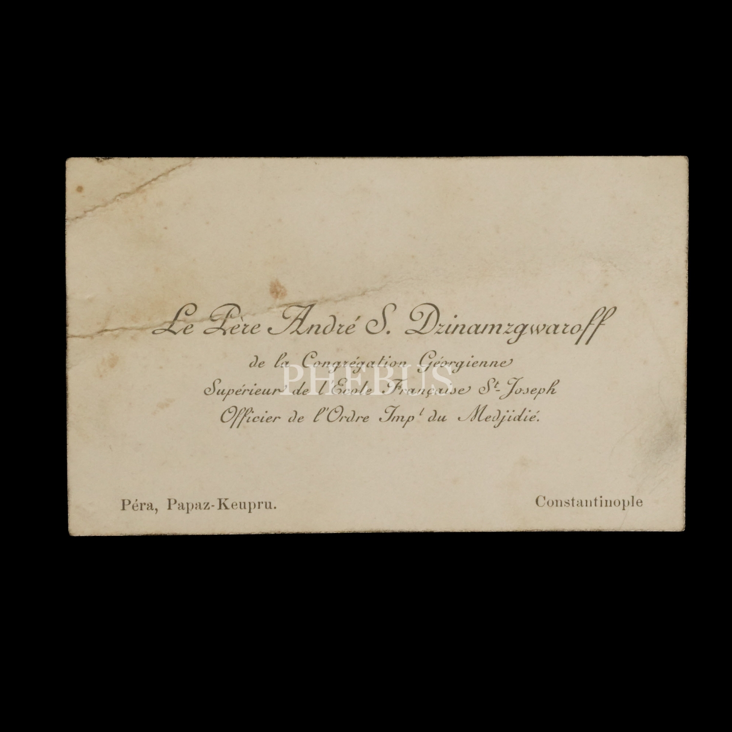 Gürcü Cemaati memurlarından Le Pere Andre S. Drinamzgwaroff´a ait kartvizit, Pera, Papaz-Keupru - Constantinople adresli, 10x6 cm...