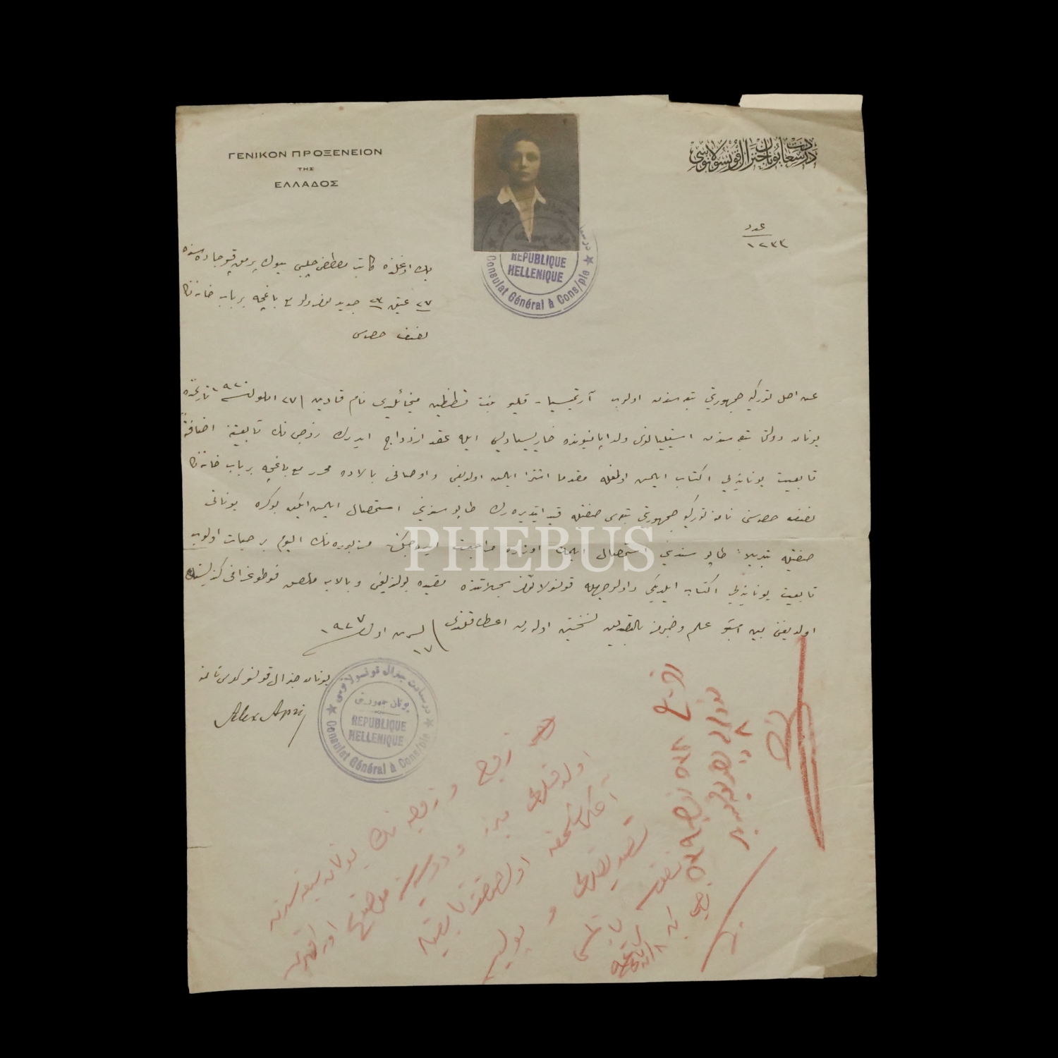 Türkiye Cumhuriyeti vatandaşı Artmisyan Hanımefendi´nin, Yunaistan Vatandaşı Harsiyadis Bey ile evlenmesi üzerine Yunanistan vatandaşlığına geçtiğini ve üzerine kayıtlı evin tapusunda yer alan "Türkiye Cumhuriyeti vatandaşı" ibaresinin "Yunanistan vatandaşı" ibaresiyle değiştirmek istemesini konu alan dilekçesi, 22x29 cm...