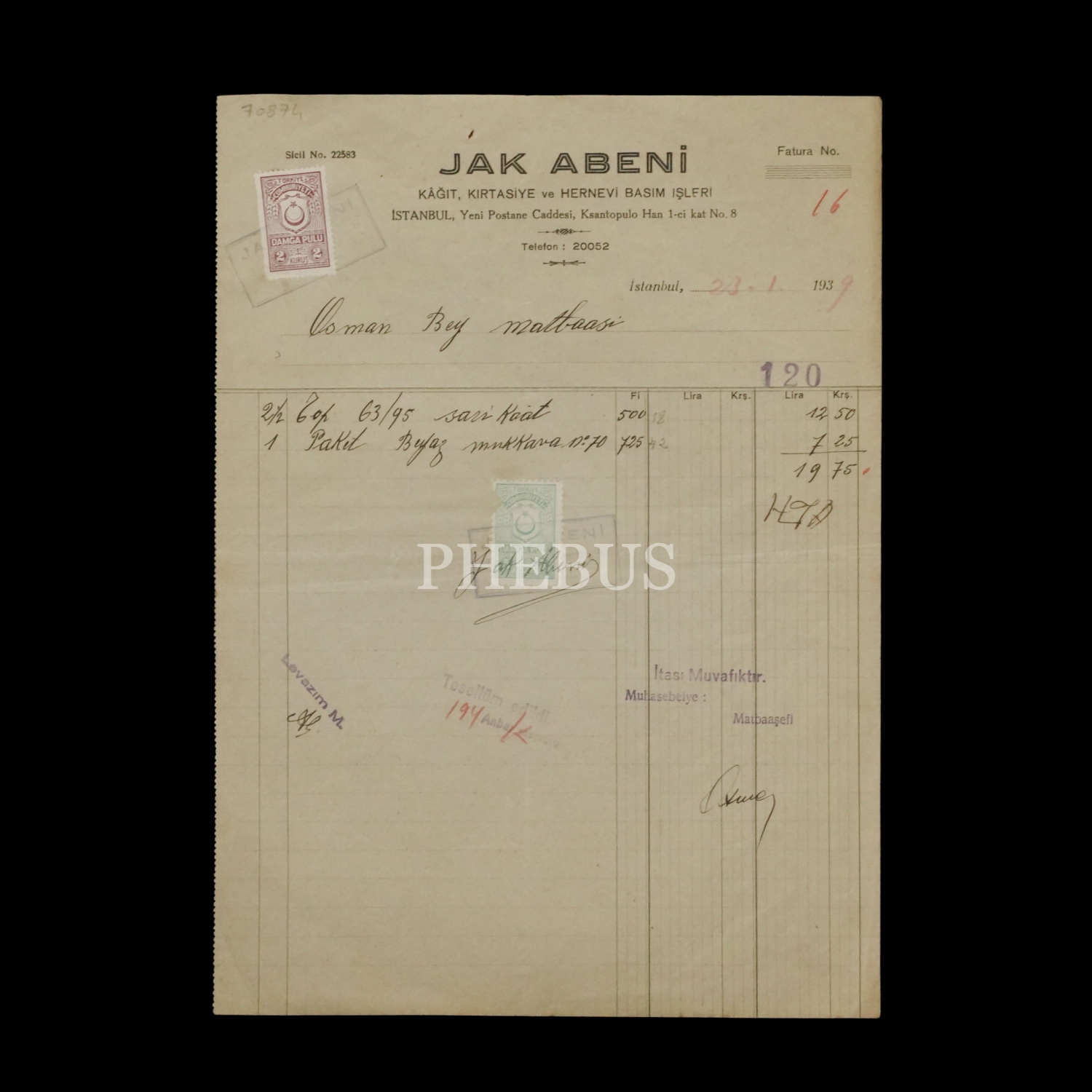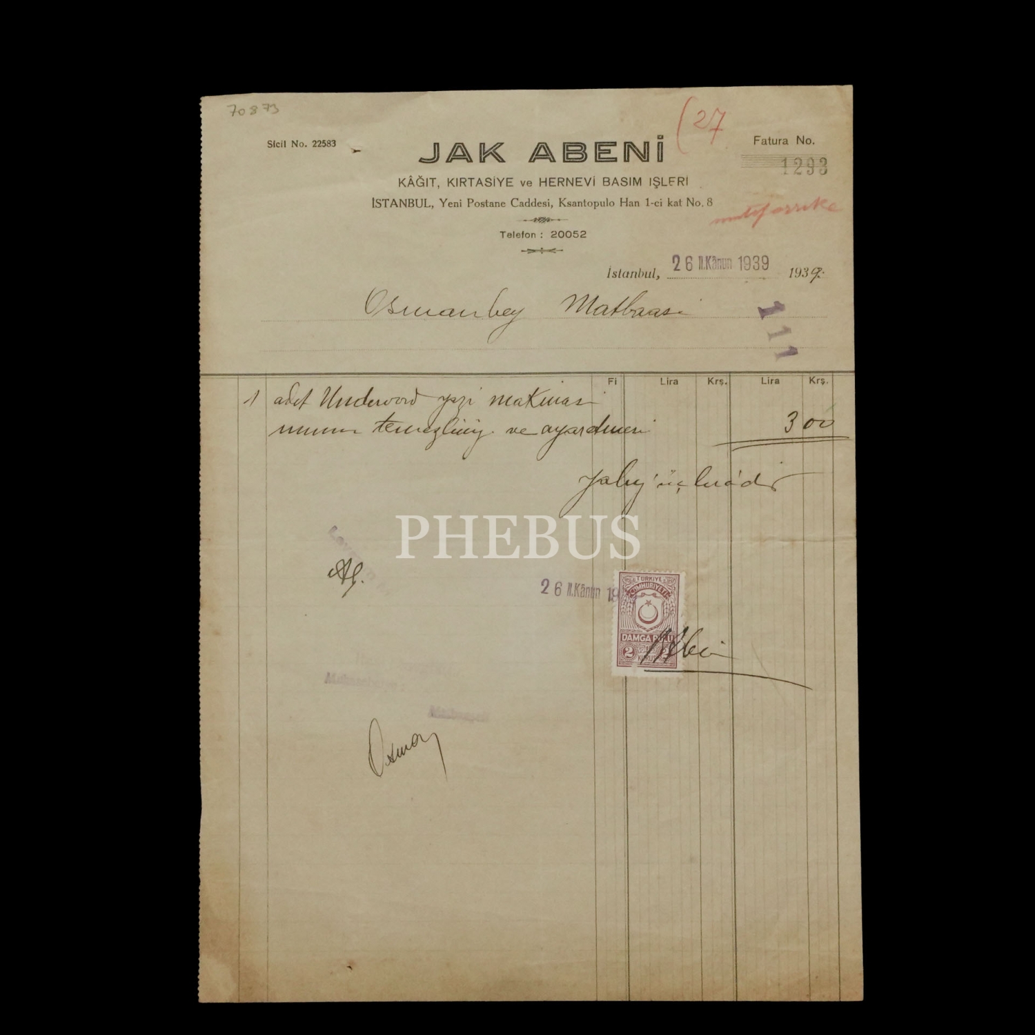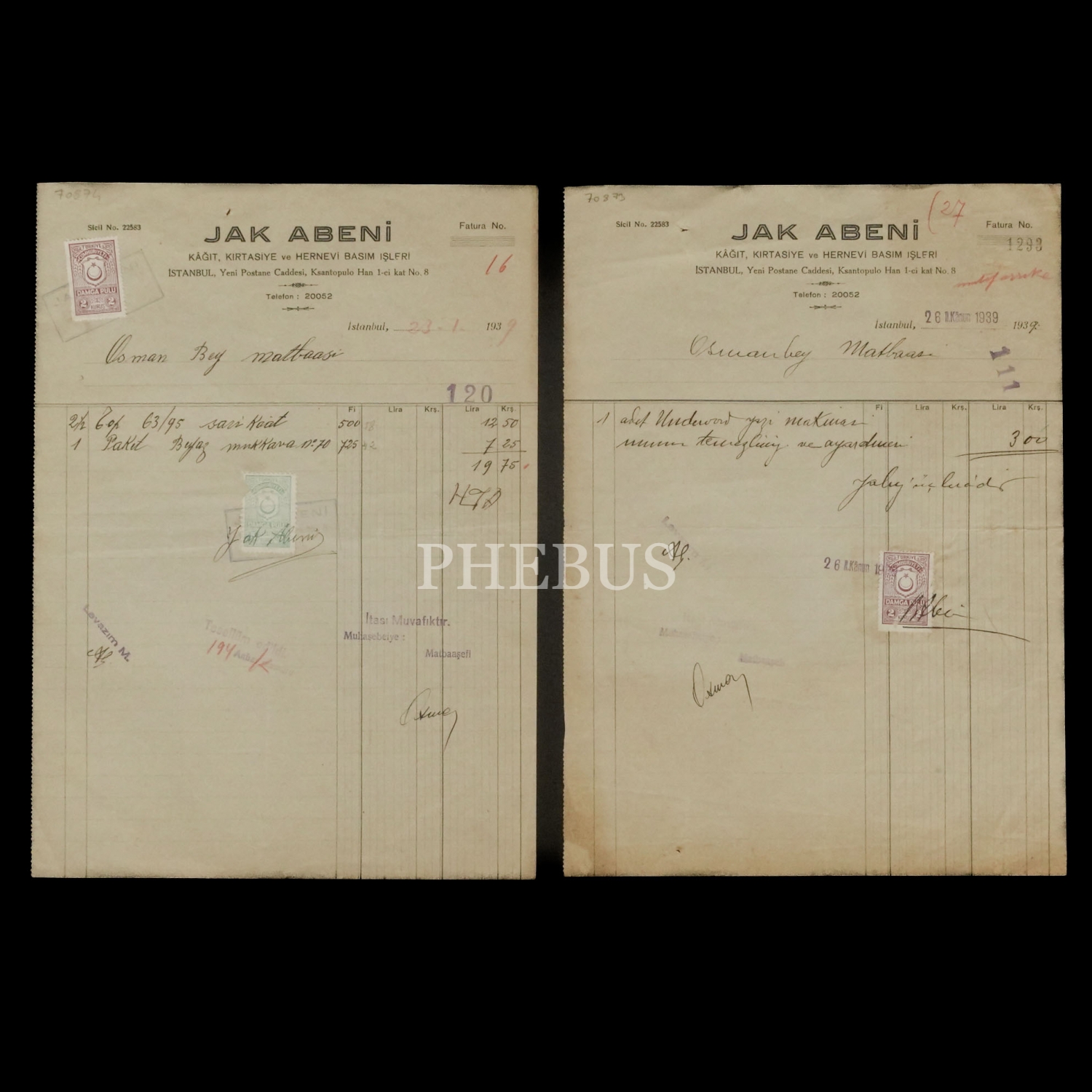 Jak Abeni (Kâğıt, Kırtasiye ve Hernevi Basım İşleri) - İstanbul antetli, 1939 tarihli iki adet makbuz, 21x29 cm...
