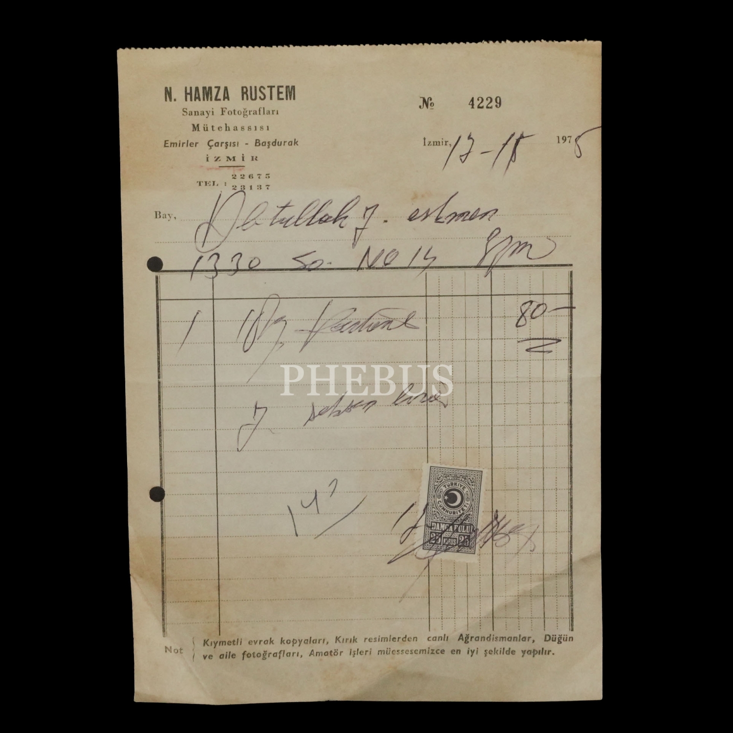N. Hamza Rüstem (Sanayi Fotoğrafları Mütehassısı) - İzmir antetli, 1978 tarihli makbuz, 17x22 cm...