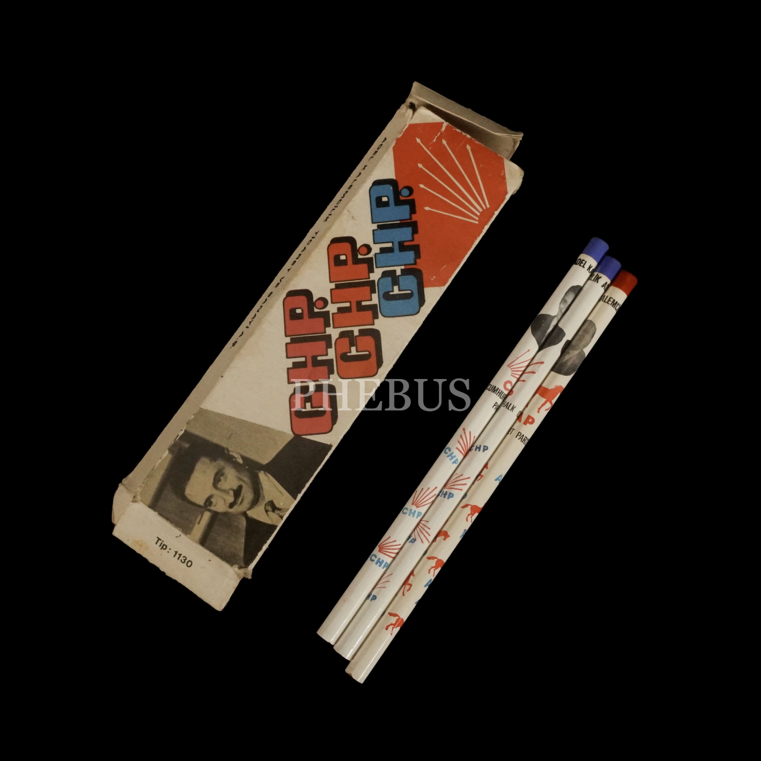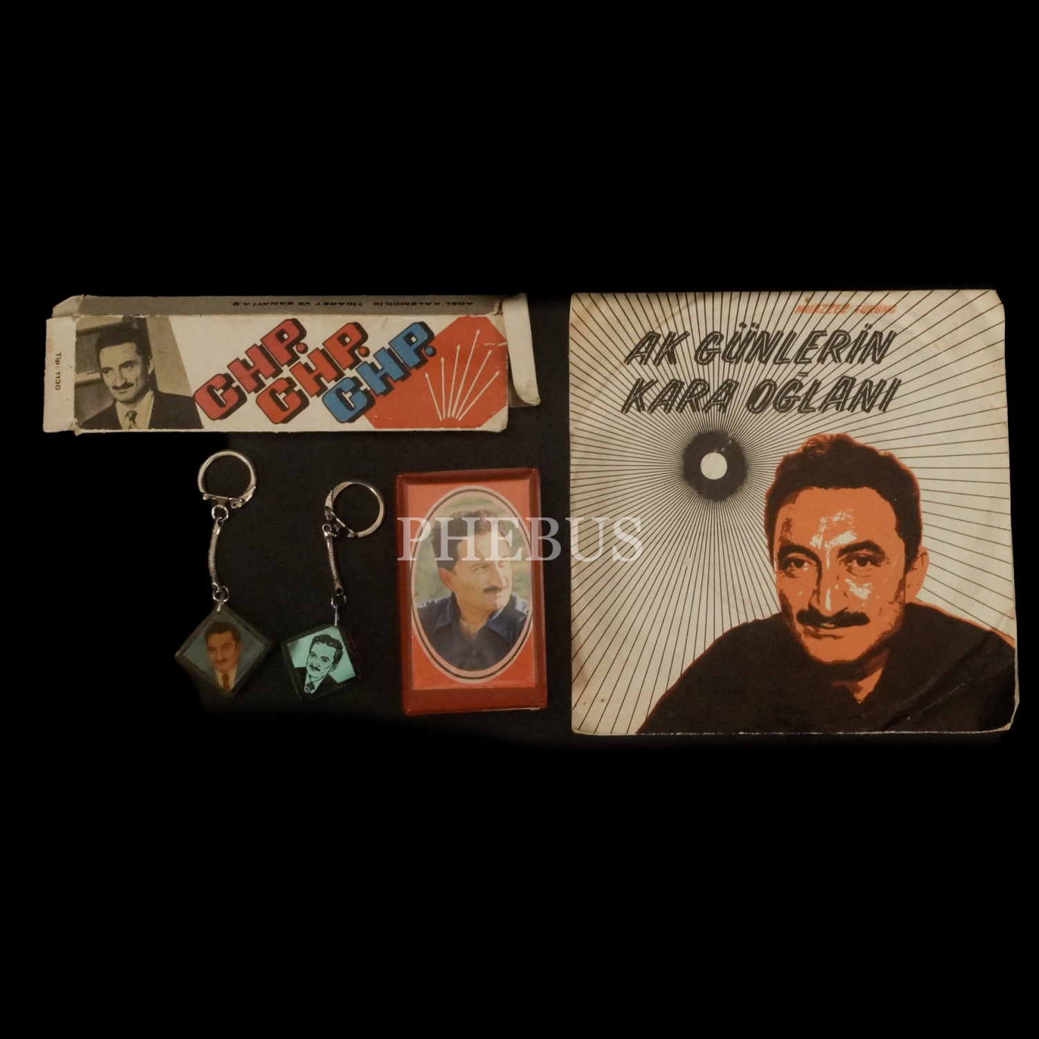 Lot içeriği: Muazzez Türüng tarafından hazırlanan Ak Günlerin Kara Oğlanı plağı, CHP yazılı, Altı Ok ve Bülent Ecevit görselli orijinal kutusunda Adel Kalemcilik üretimi üç adet parti reklamlı kalem (ikisi CHP, biri AP reklamlı), Bülent Ecevit görselli, büyük boy (9,5x5,5x1,5 cm) kibrit kutusu (dolu), Bülent Ecevit ve Altı Ok görselli iki adet anahtarlık...