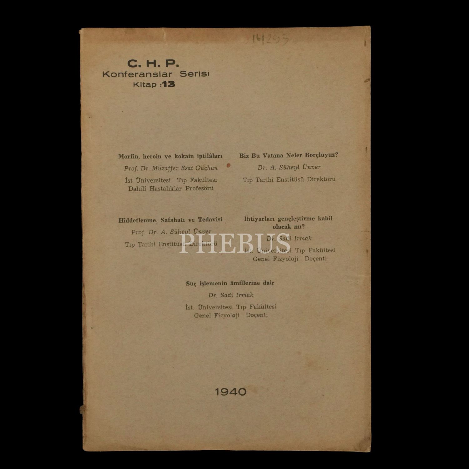 C.H.P. KONFERANSLAR SERİSİ (Kitap: 13): 1) Morfin, Heroin ve Kokain İptilâları (Muzaffer Esat Güçhan) 2) Biz Bu Vatana Neler Borçluyuz? (Süheyl Ünver) 3) Hiddetlenme, Safahatı ve Tedavisi (Süheyl Ünver) 4) İhtiyarları Gençleştirme Kabil Olacak Mı? (Sadi Irmak) 5) Suç İşlemenin Âmillerine Dair (Sadi Irmak), 1940, Recep Ulusoğlu Basımevi, 63 sayfa, 17x24 cm...