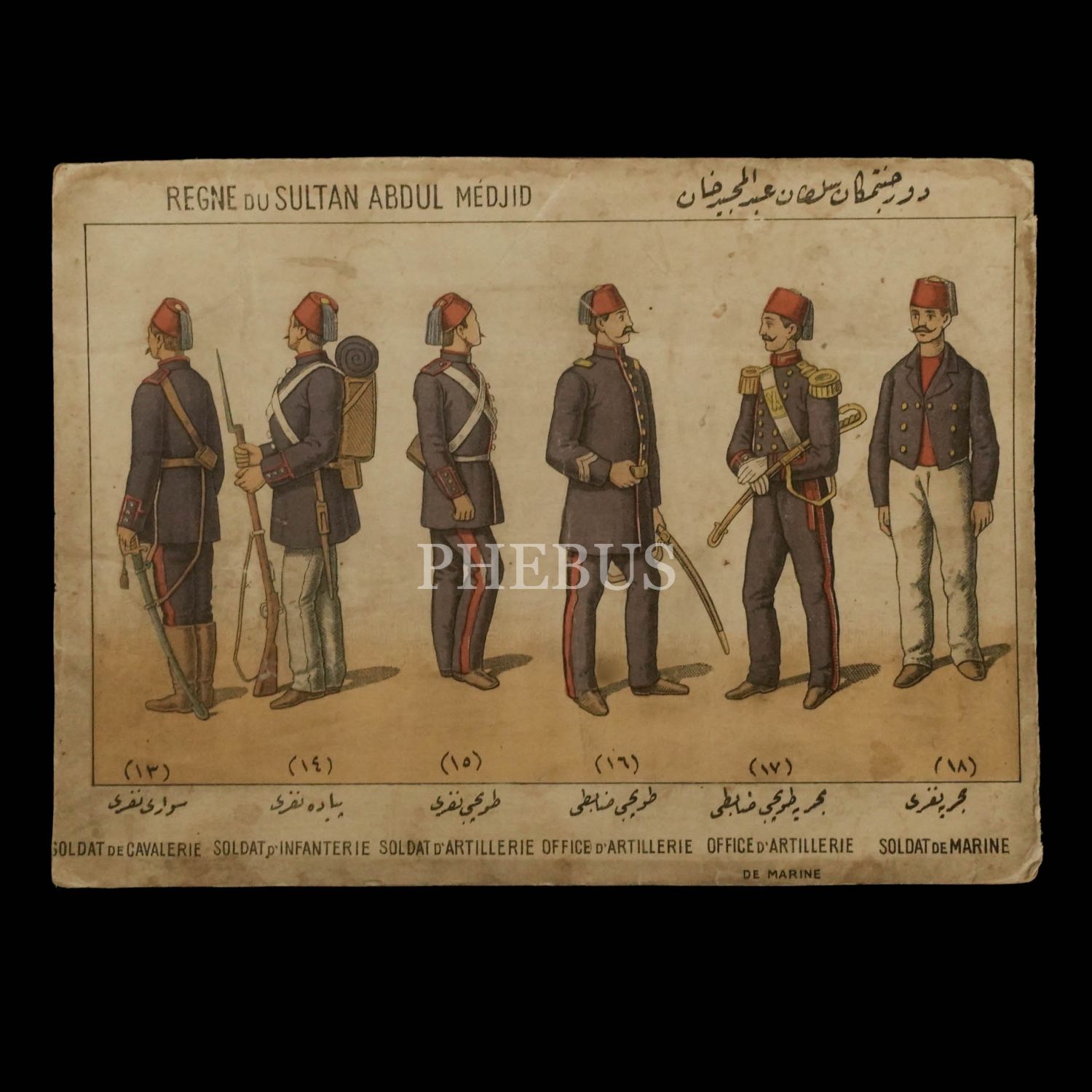 Sultan Abdülmecid dönemi Bahriyeli erler ve Bahriyeli topçu sınıfının üniformalarının tasvir edildiği kart, 21x16 cm...