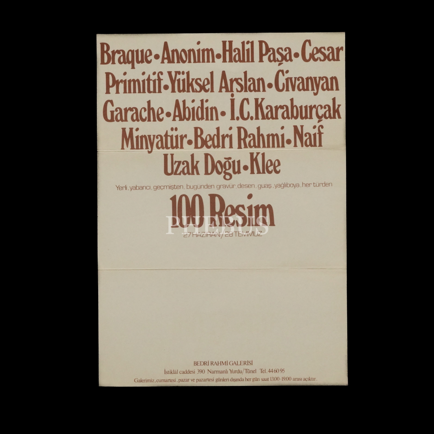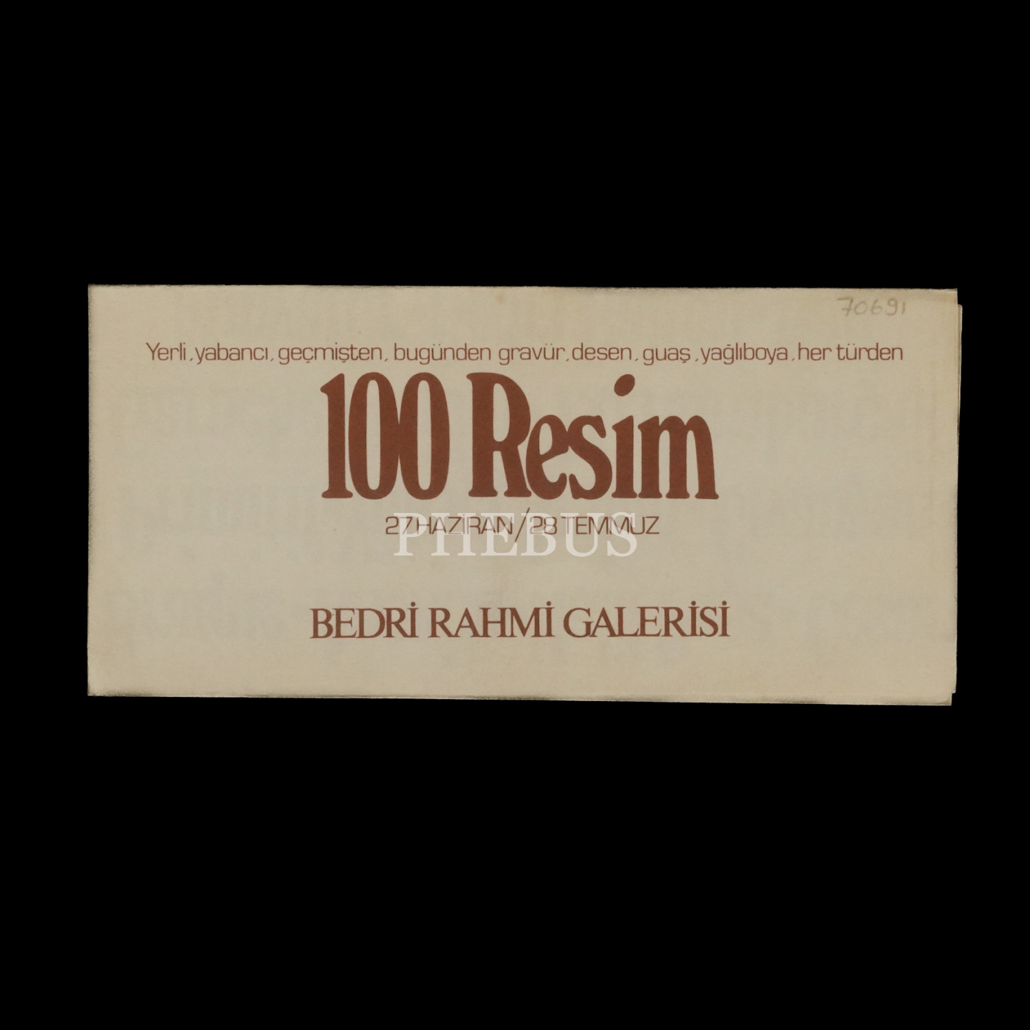 Yerli, yabancı, geçmişten, bugünden gravür, desen, guaş, yağlıboya, her türden 100 RESİM (27 Haziran-28 Temmuz) sergi davetiyesi, Bedri Rahmi Galerisi, 19x9 cm...