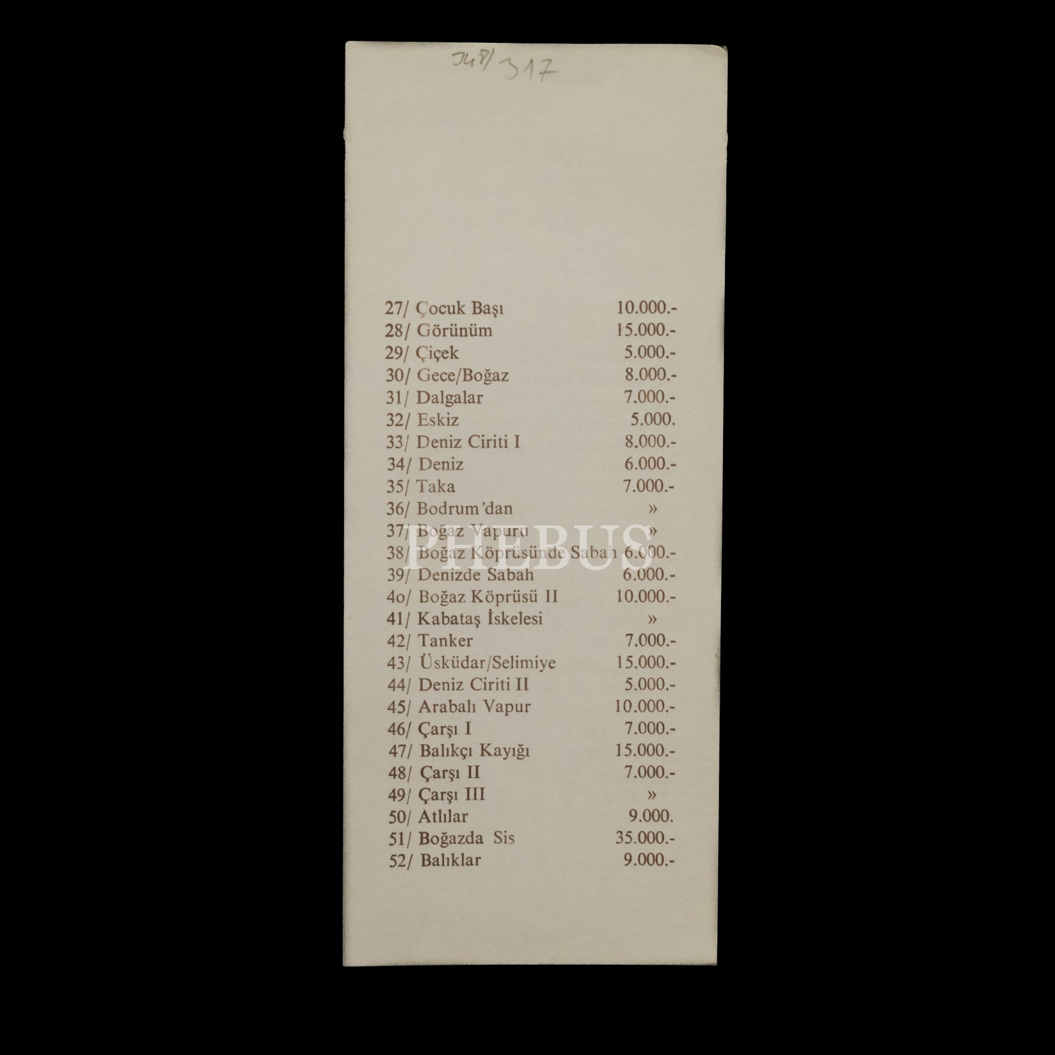 Eserlerin fiyat listesiyle birlikte...