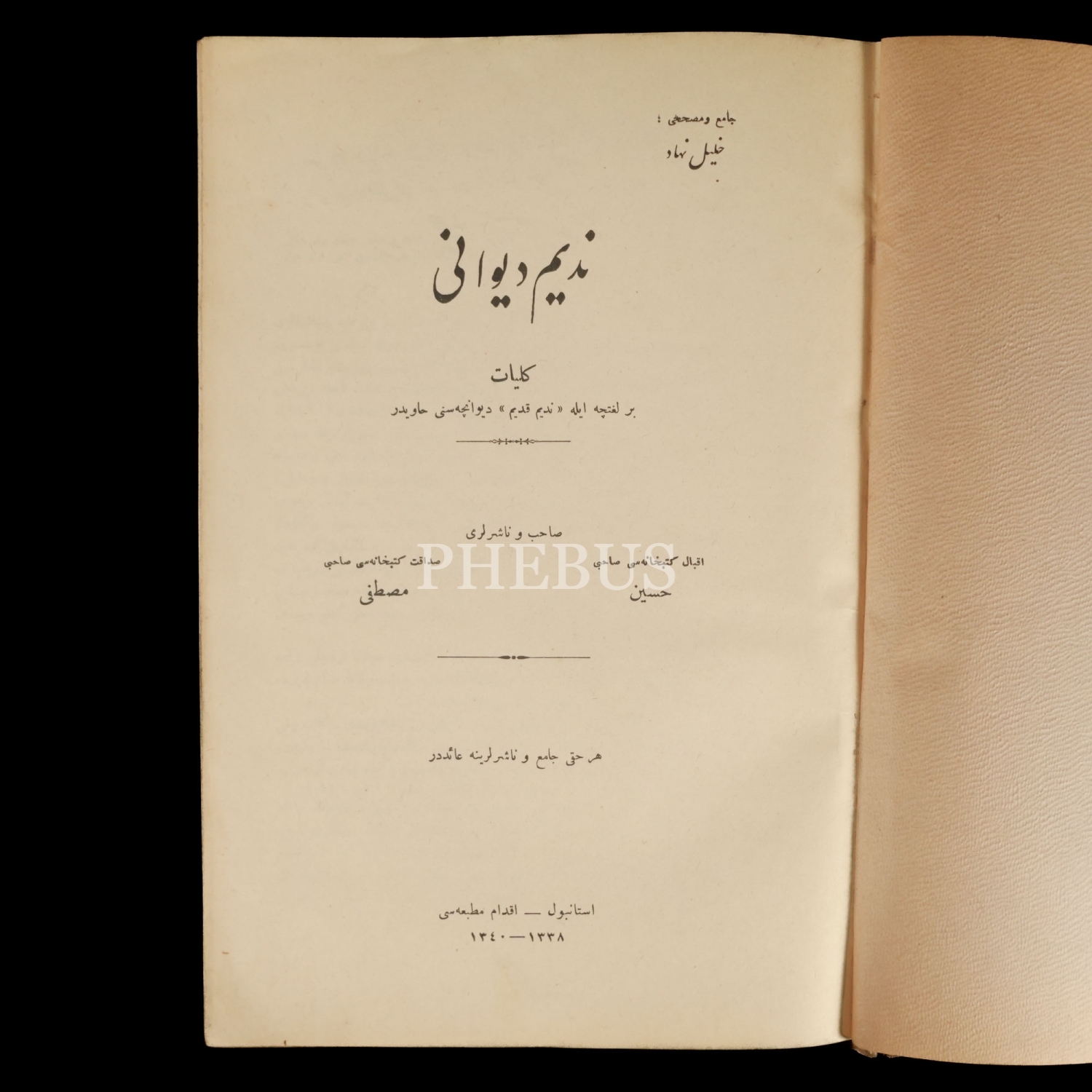 NEDİM DİVANI, (Toplayan/düzenleyen: Halil Nihat), 1338, İkdam Matbaası, 374 sayfa, 24x16 cm...