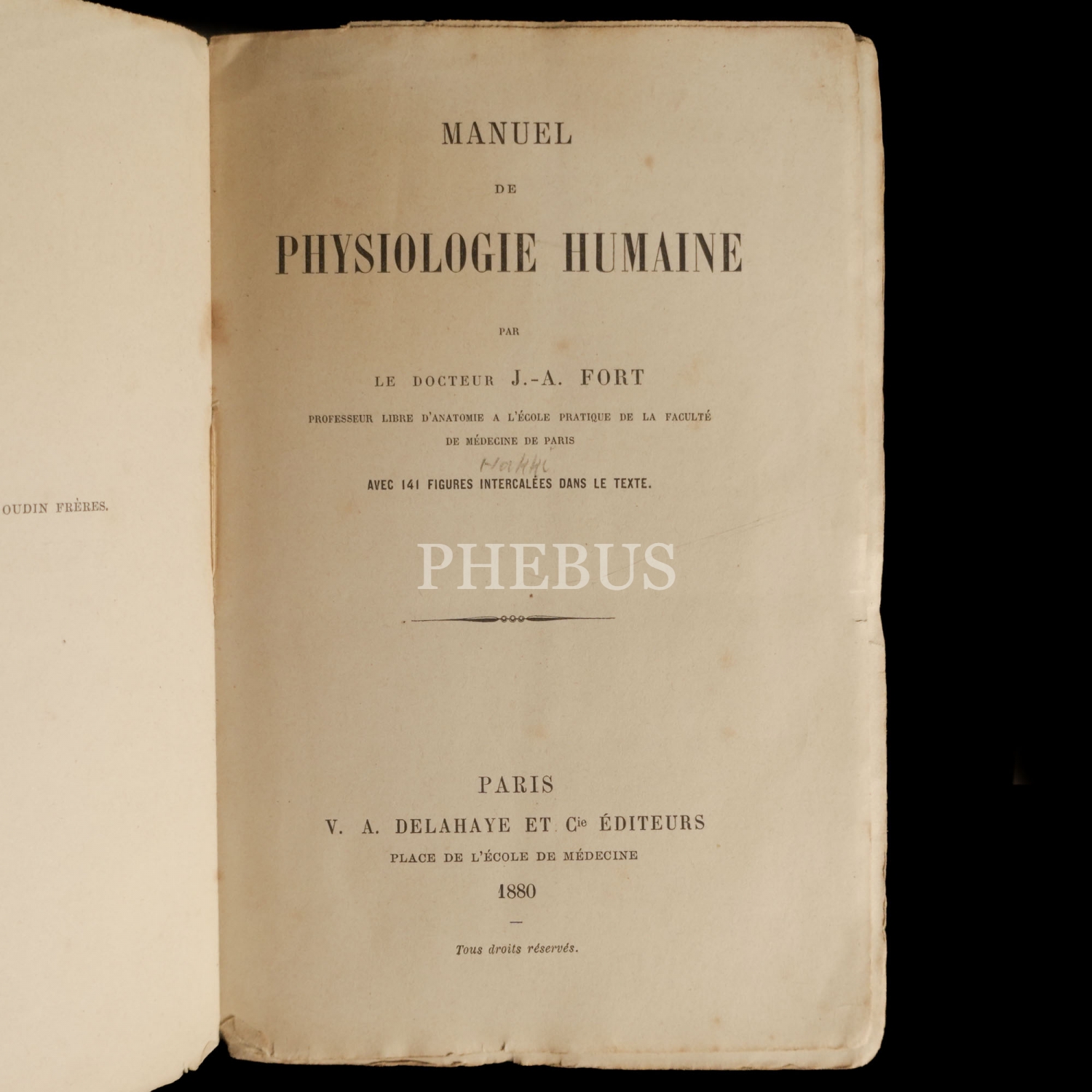 MANUEL DE PHYSIOLOGIE HUMAINE, J. A. Fort, 1880, Paris, 892 sayfa, 18x11 cm...