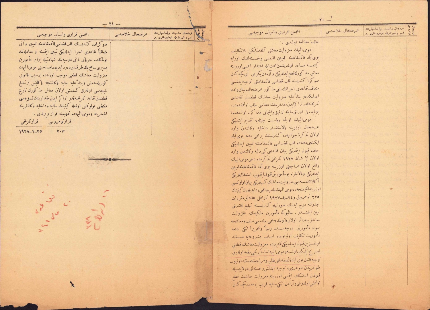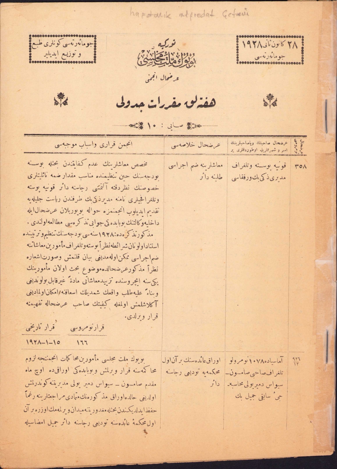 Türkiye Büyük Millet Meclisi Arzuhal Encümeni 1928 Haftalık Müfredat Cetveli, sırtı tamirli, 21 sayfa, 20x28 cm