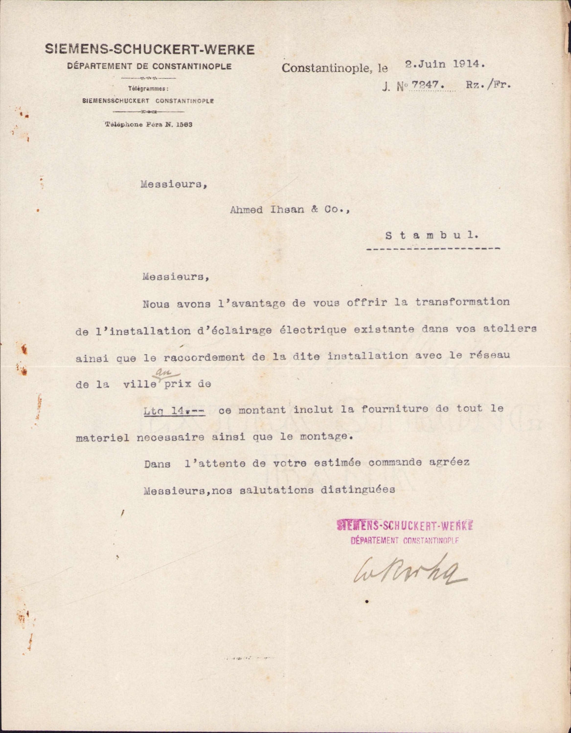 Siemens - Schuckert - Werke Departement de Constantinople anteli Fransızca doküman, 1914, 20x28 cm