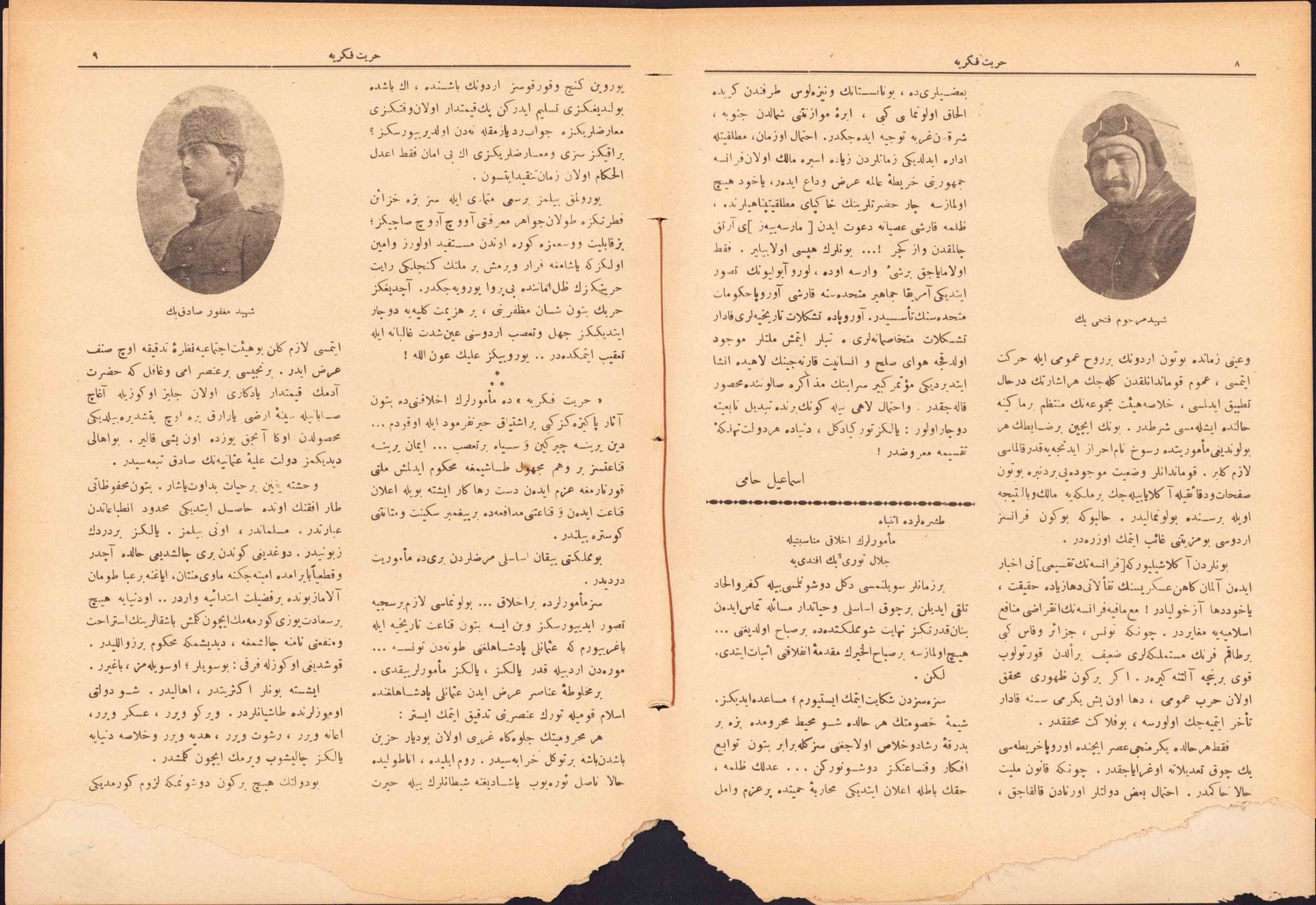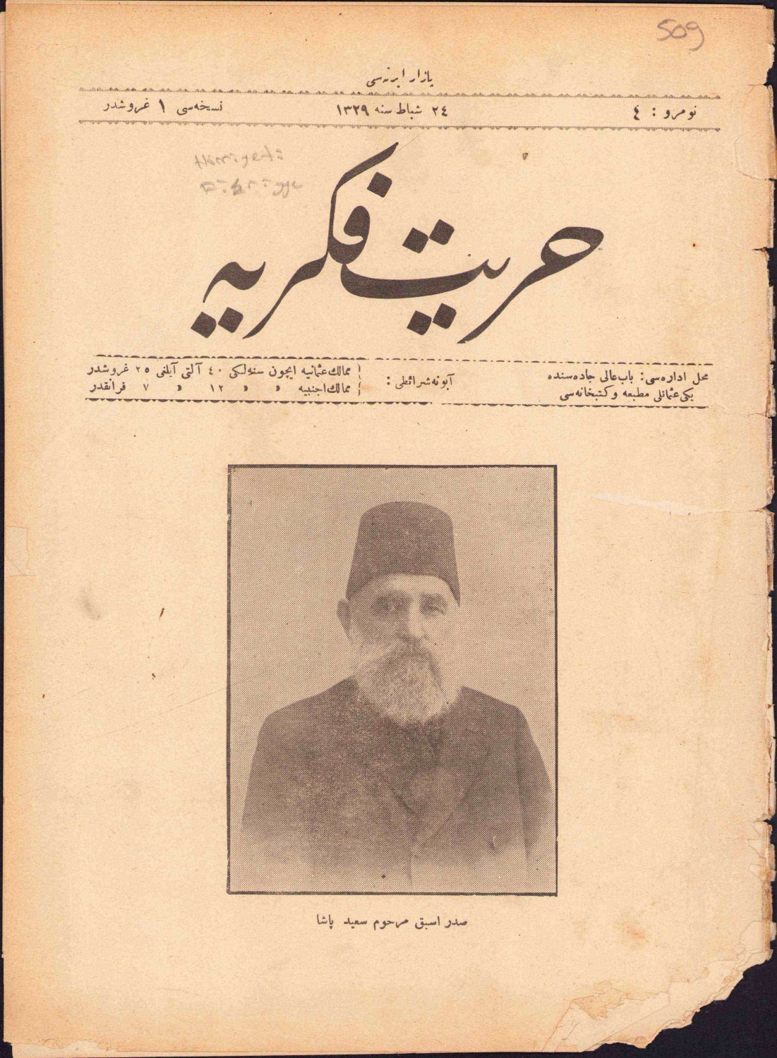 Osmanlıca Hürriyet-i Fikriye mecmuası, 1329 tarihli, kapak Sait Paşa, sayfaların bir kenarı kopuk, 16 sayfa, 20x26 cm