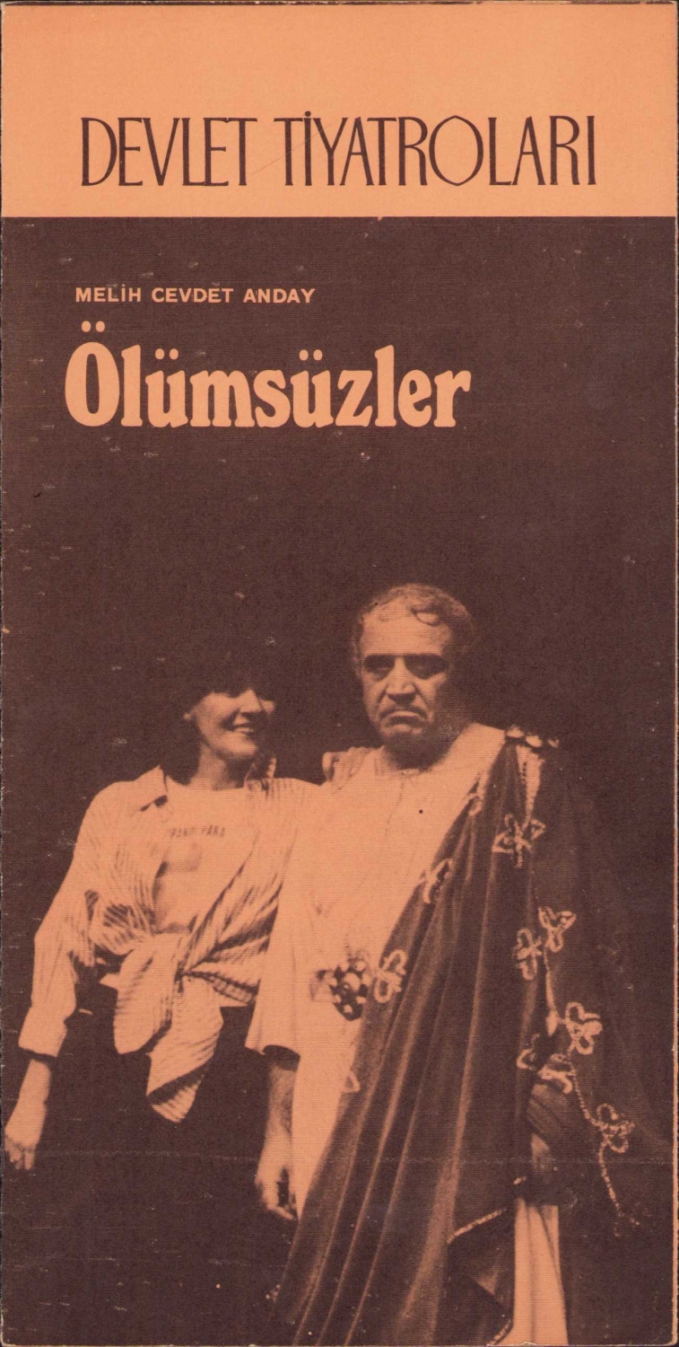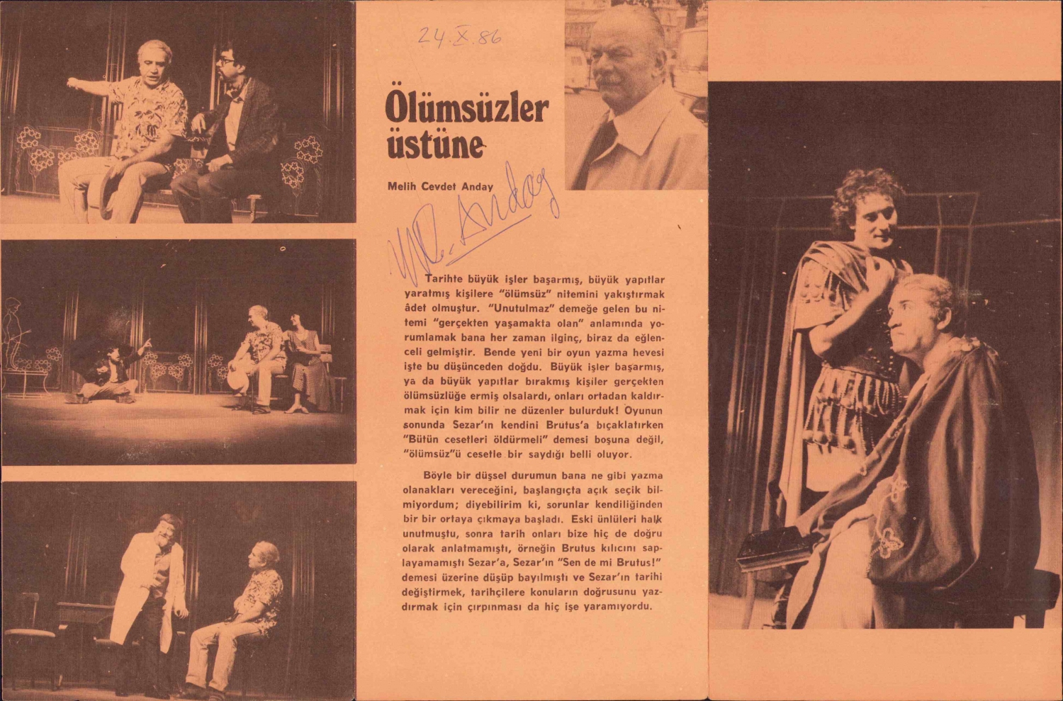 Devlet Tiyatroları - Melih Cevdet Anday Ölümsüzler oyunu programı, Melih Cevdet Anday tarafından imzalı,1987, 10x20 cm