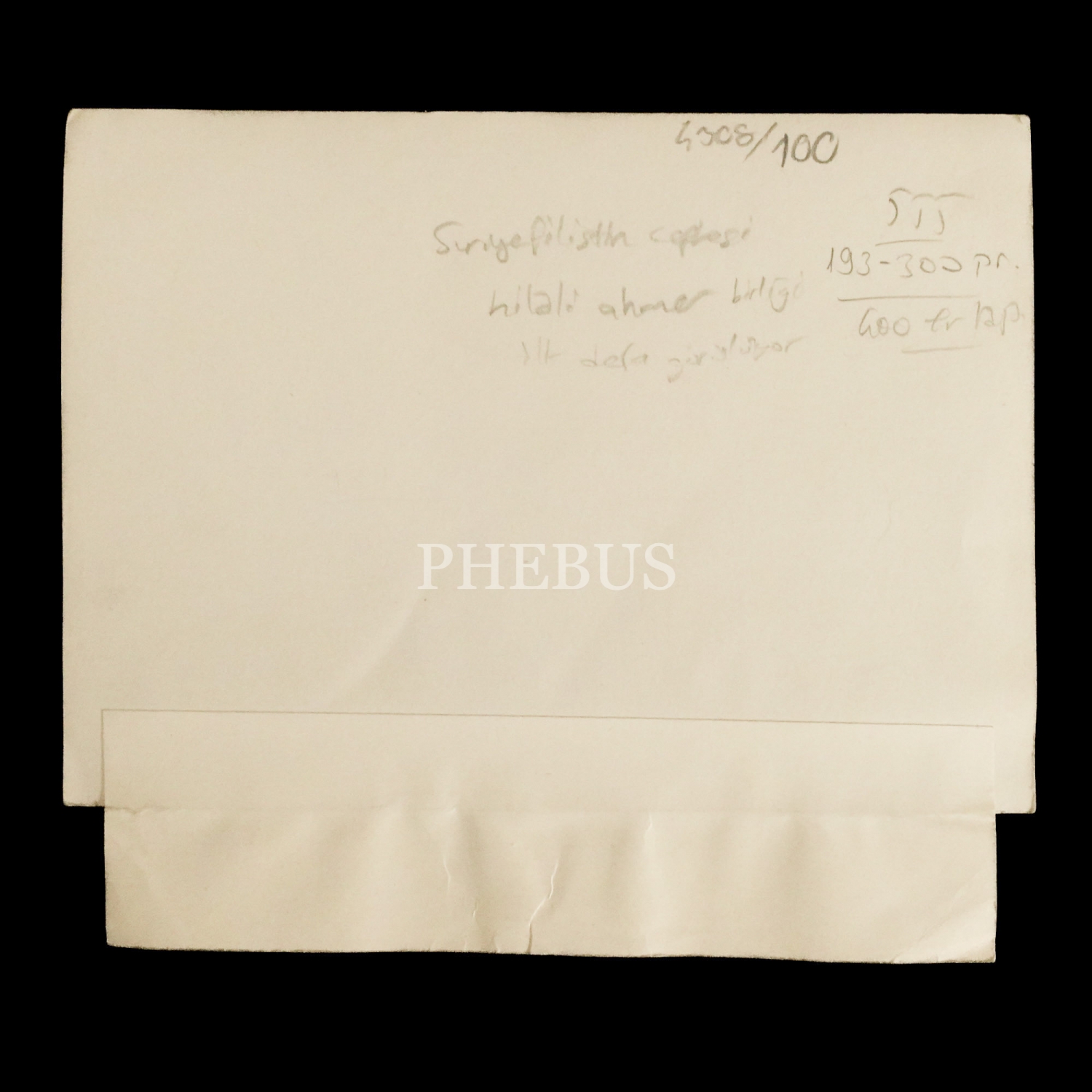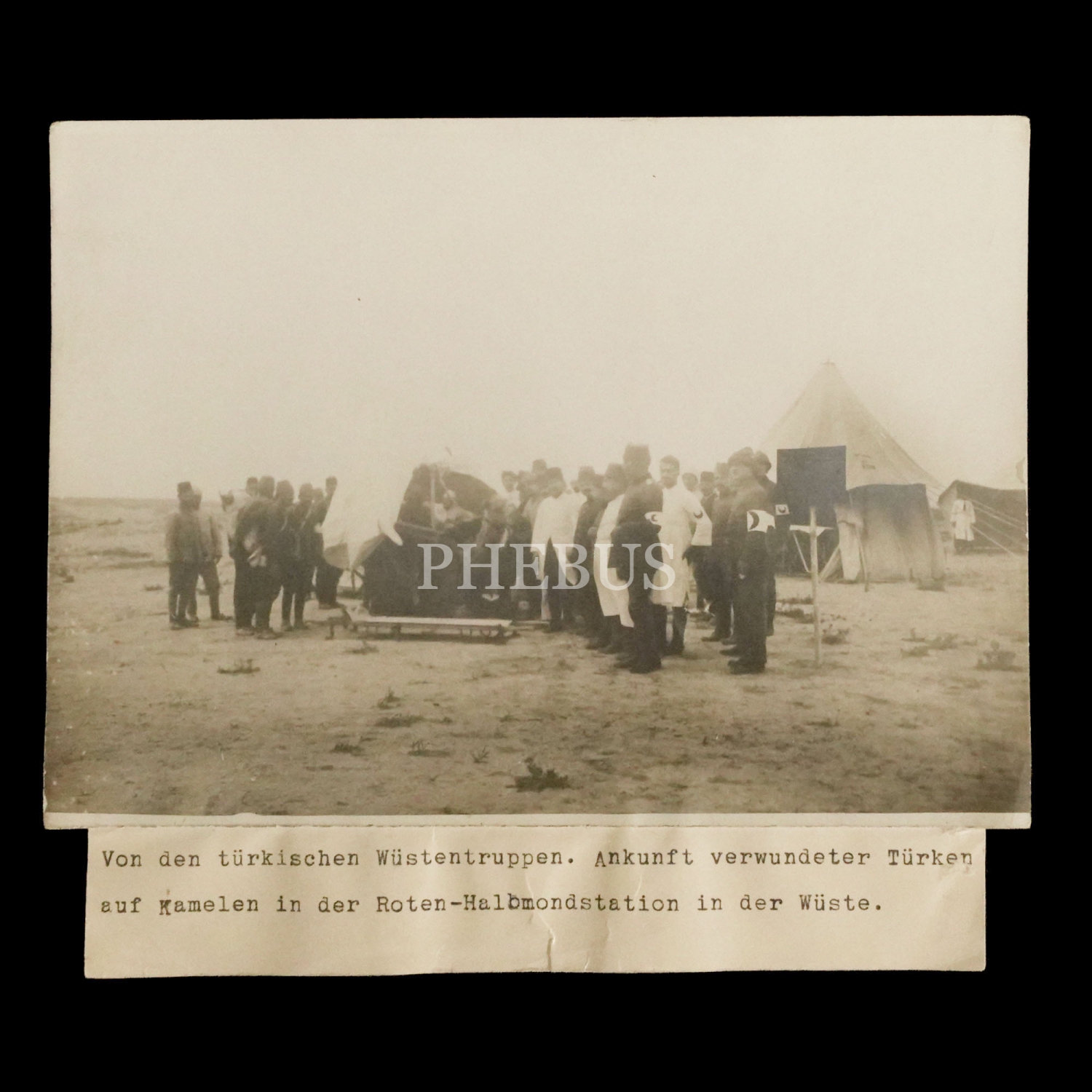 Yaralı Türk askerlerin develerle çöldeki Hilal-i Ahmer istasyonuna gelişini belgeleyen, Almanca açıklama bantlı fotoğraf, 18x13 cm...