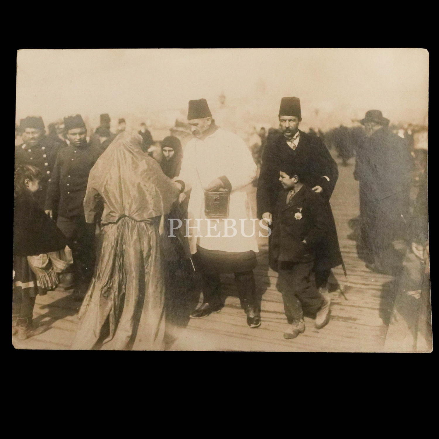 Balkan Harbi´nde vazife alan Türk askerleri menfaatine Galata Köprüsü üzerinde bağış toplayan Hilal-i Ahmer gönüllüleri (biri çocuk), 15x11 cm...
