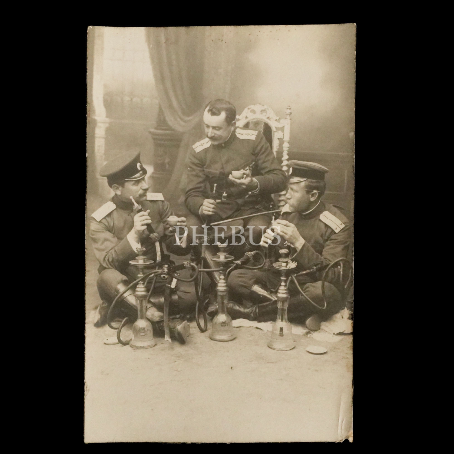 Balkan Harbi yıllarında Edirne´ye ulaşan Bulgar askerlerinden bir grubun, nargile ve Türk kahvesi içiyormuş gibi poz verdikleri mizansen stüdyo fotoğrafı, 9x14 cm...