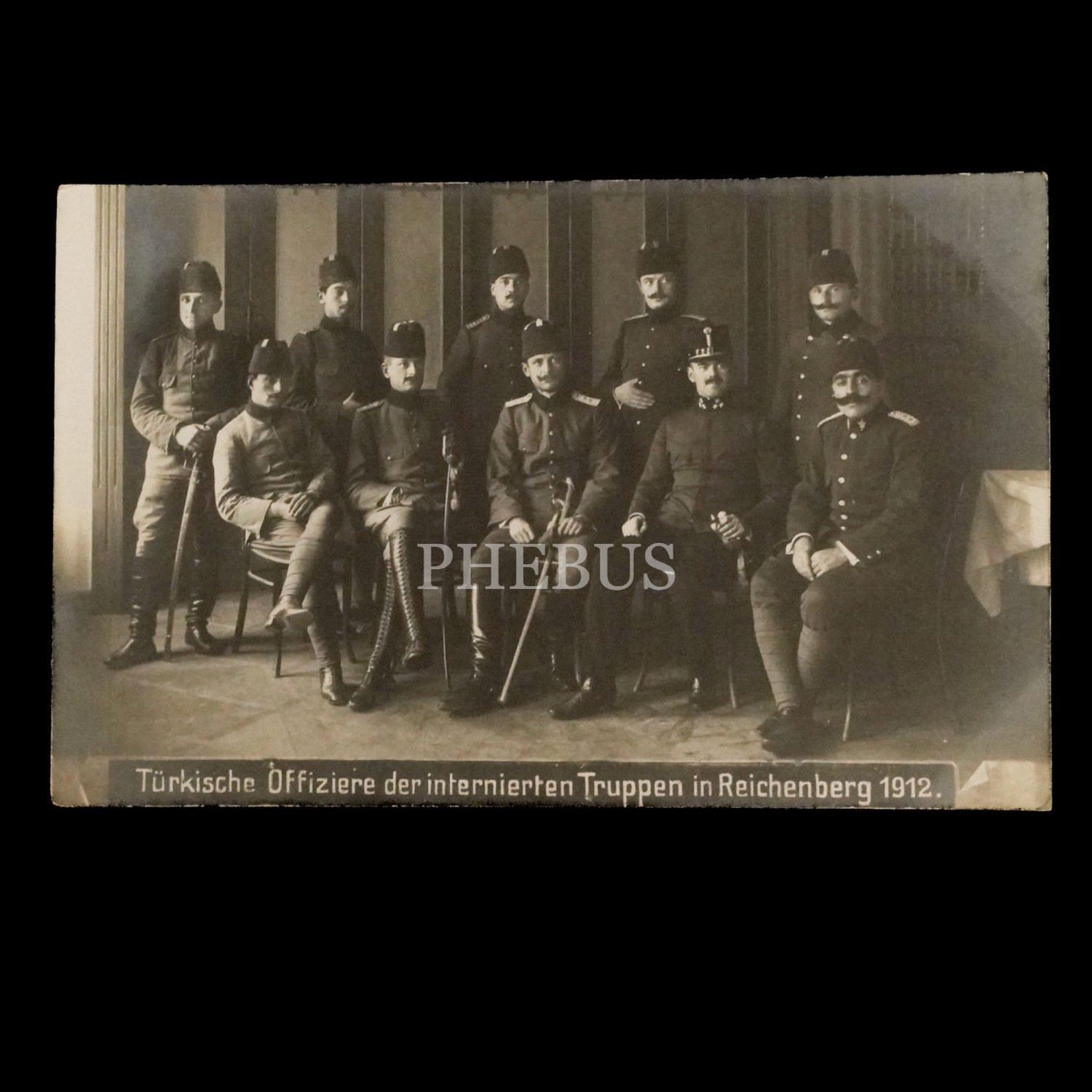 Balkan Harbi´nde bozguna uğrayan Türk müfrezesine mensup Osmanlı subayları, zorunlu olarak sığındıkları Almanya´nın Reichenberg şehrinde, ed. Ferd. Stracke, Kamme fotograf, Reichenberg, 14x9 cm...