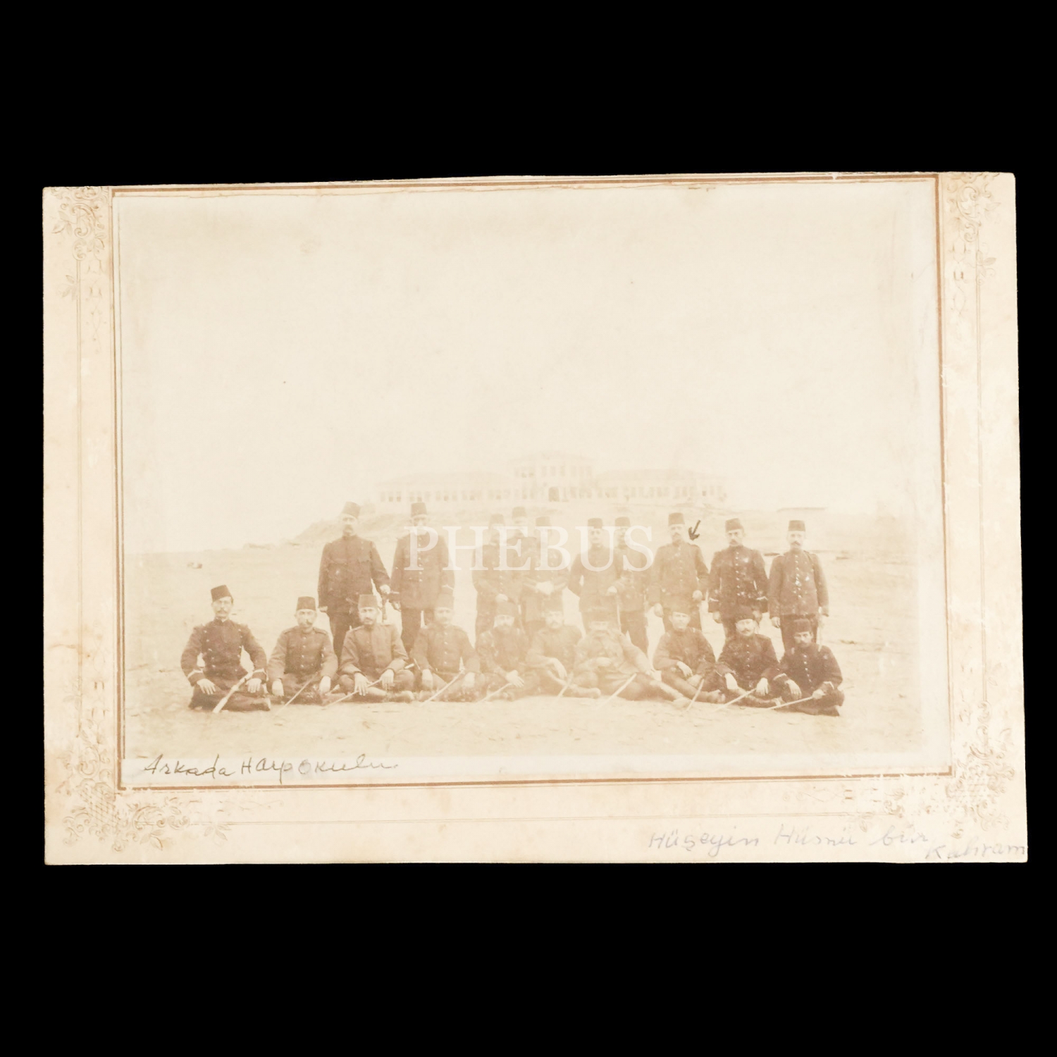 Askeri öğrencilerin, harp okulu önünde aldırdıkları hatıra fotoğrafı, 21x15 cm...
