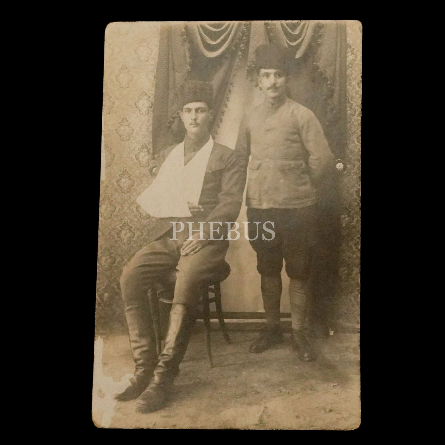 Birinci Dünya Savaşı´nda kolundan yararlanan bir askerin arkadaşıyla birlikte aldırdığı hatıra fotoğrafı, 9x14 cm...