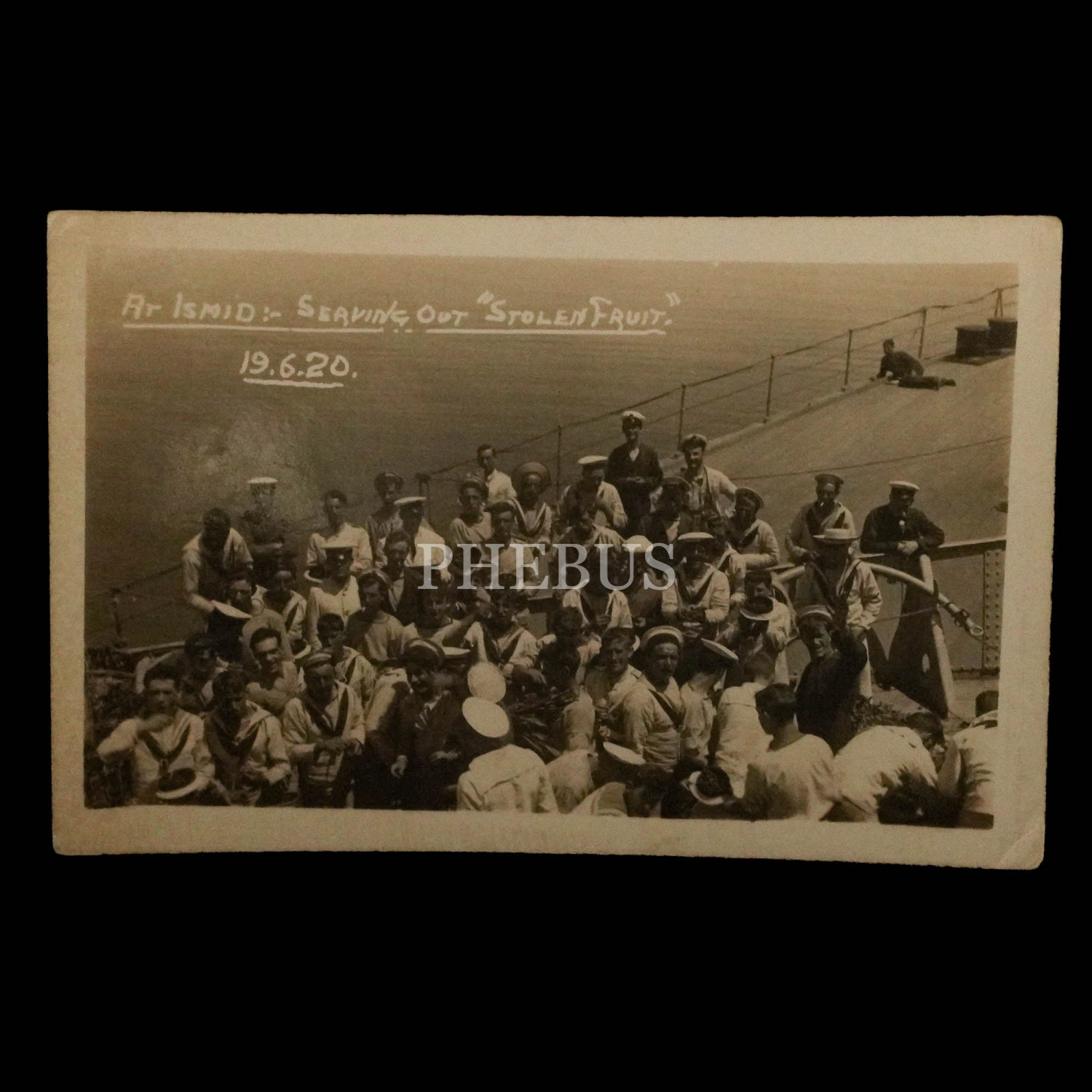İzmit - Yarımca´da bulunan bahçelerden çaldıkları kirazlarla poz veren İngiliz gemiciler, 19 Haziran 1920, 14x9 cm...