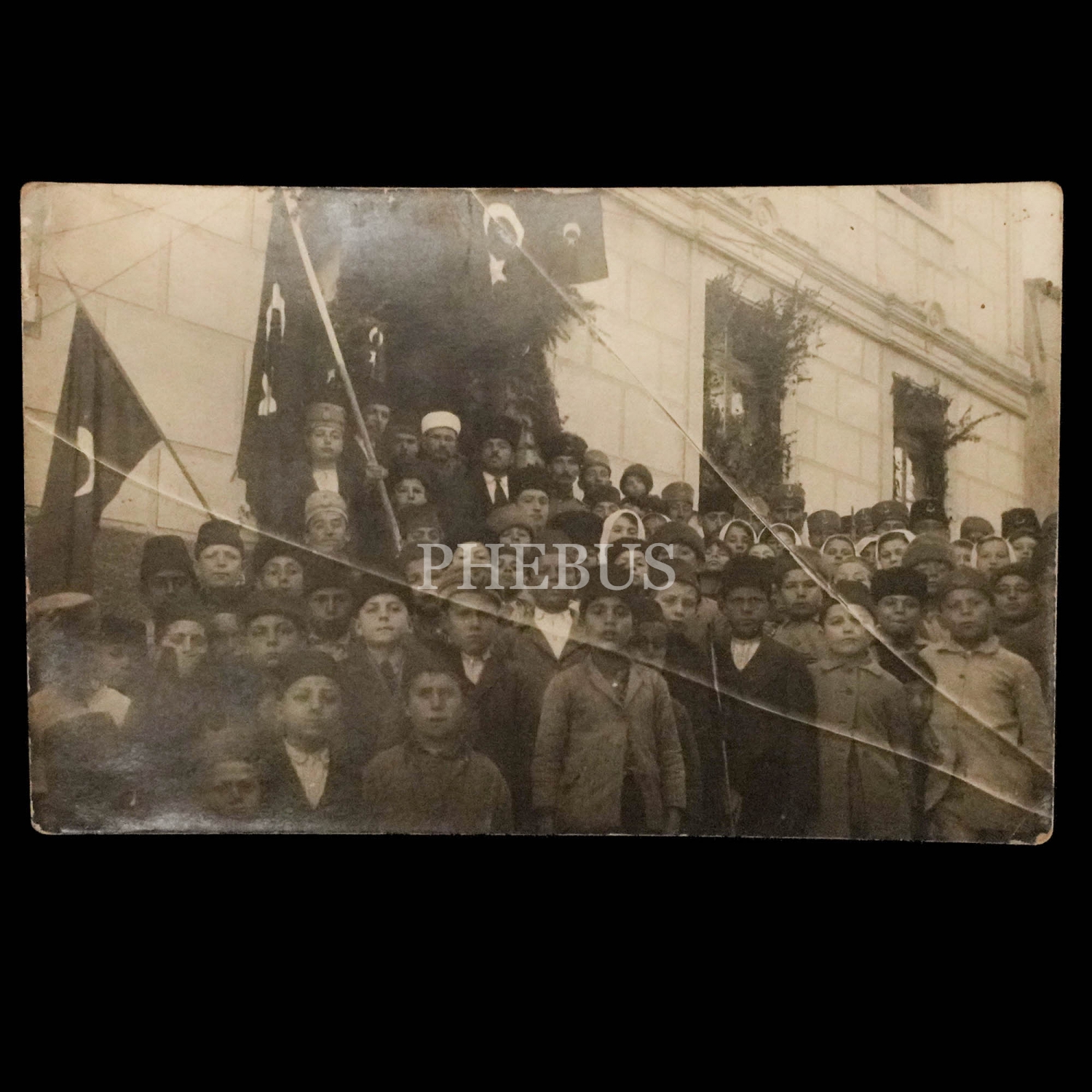 Kos Adası Yetimhanesi´nin açılışında yetimler ve öğretmenlerinin hatıra fotoğrafı, 14x9 cm...
