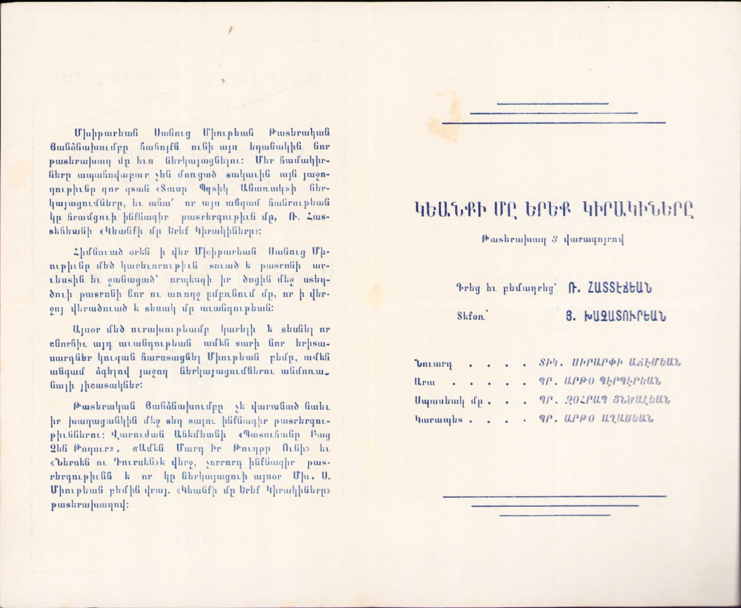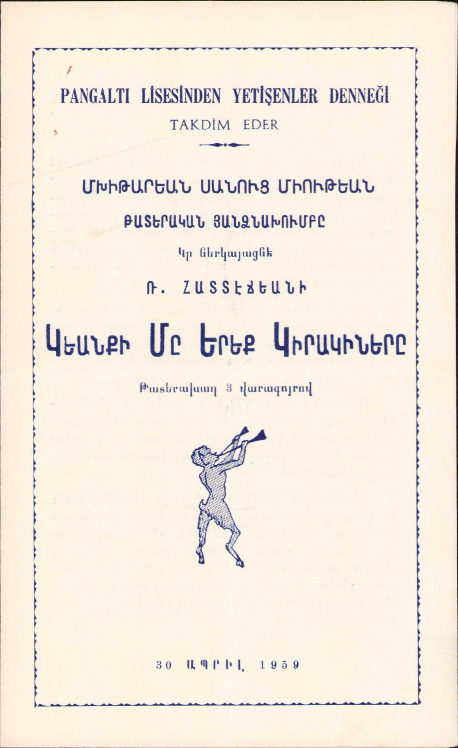 Türkçe - Ermenice Pangaltı Lisesinden Yetişenler Derneği merasim programı, 1959, 11x18 cm