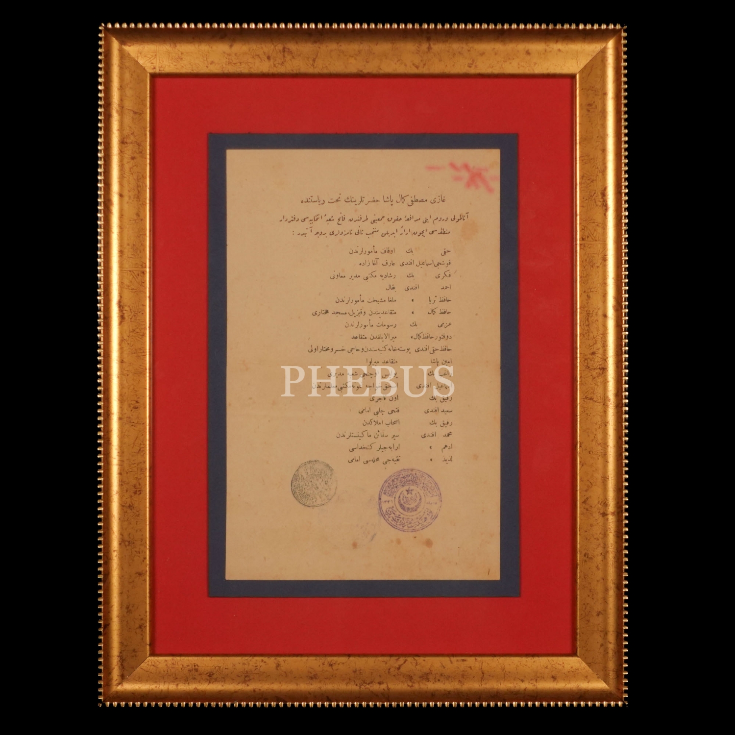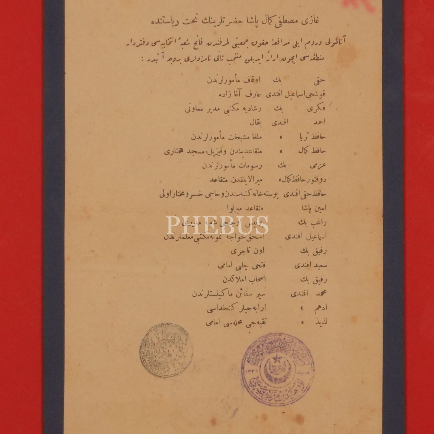Anadolu ve Rumeli Cemiyeti´nin Fatih Şubesi Defterdarlık Mıntıkası´ndan gösterilen müntehib-i sani namzetlerinin isimlerinin yazılı olduğu liste, çerçevesiyle birlikte 29x37 cm...