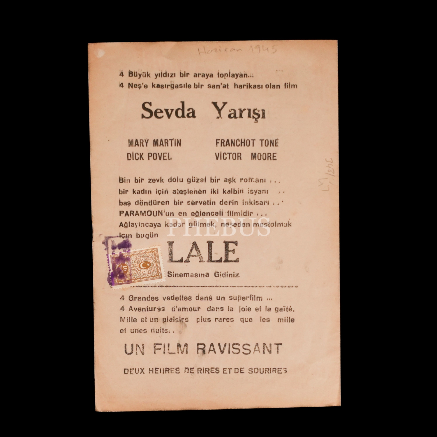 "4 Büyük yıldızı bir araya toplayan... 4 Neş´e kasırgasile bir san´at harikası olan film: Sevda Yarışı (Mary Martin - Franchot Tone - Dick Povel - Victor Moore) / Bin bir zevk dolu güzel bir aşk romanı... Bir kadın için ateşlenen iki kalbin isyanı... Baş döndüren bir servetin derin inkisarı... PARAMOUN´un en eğlenceli filmidir... Ağlayıncaya kadar gülmek, neşeden mestolmak için bugün LALE Sinemasına Gidiniz." *Damga Pullu.