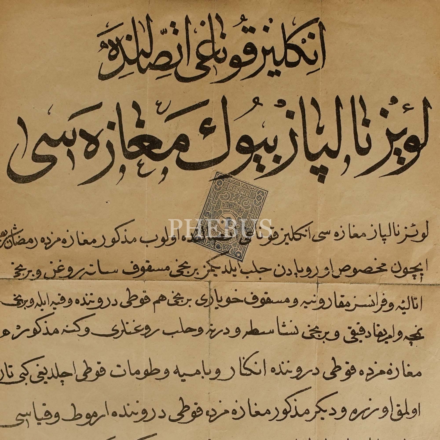 Louis Nalpasse Büyük Mağazası´nın, Ramazan ayı için Avrupa´dan ithal ettiği domates, enginar, bamya, havyar gibi gıda ürünlerini duyurmak için hazırladığı afiş, "İngiliz Konağı İttisalında Louis Nalpasse Büyük Mağazası", 22x36 cm...