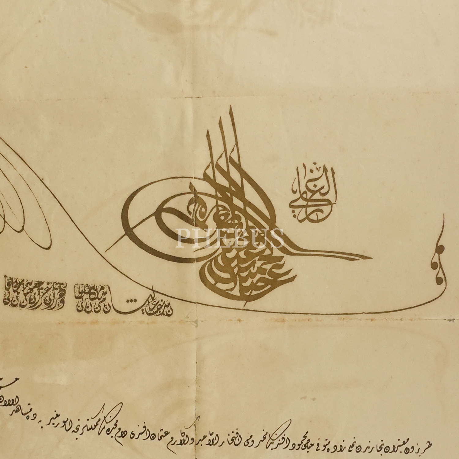 Trabzon tüccarından Nahlızade Hacı Mahmud Efendi´nin mahdumu Osman Efendi´nin Dördüncü Derece Mecidi Nişanı almaya hak kazandığına dair Sultan İkinci Abdülhamit tuğralı berat, 1309, 37x57 cm...