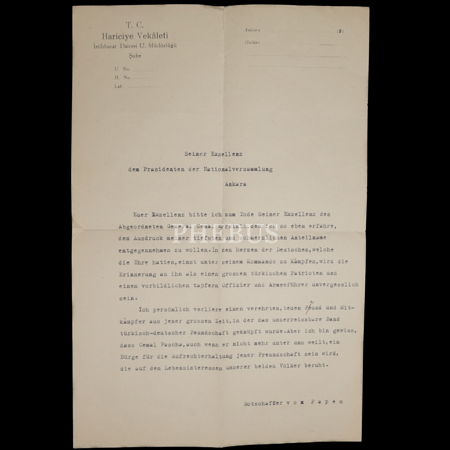 Alman Büyükelçisi Franz Von Papen´in, Cemal Mersinli´nin vefatı sebebiyle T.C. Hariciye Vekâleti İstihbarat Dairesi U. Müdürlüğü" antetli kâğıda kaleme aldığı daktilo başsağlığı mektubu, 21x31 cm...
