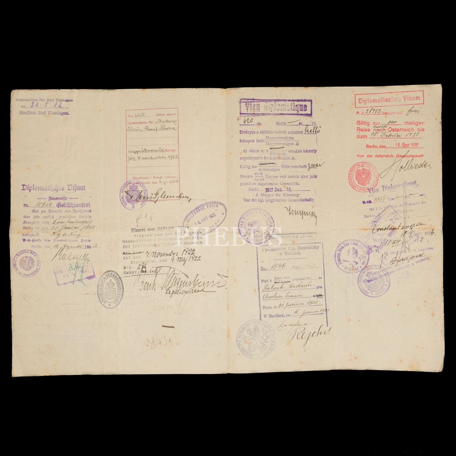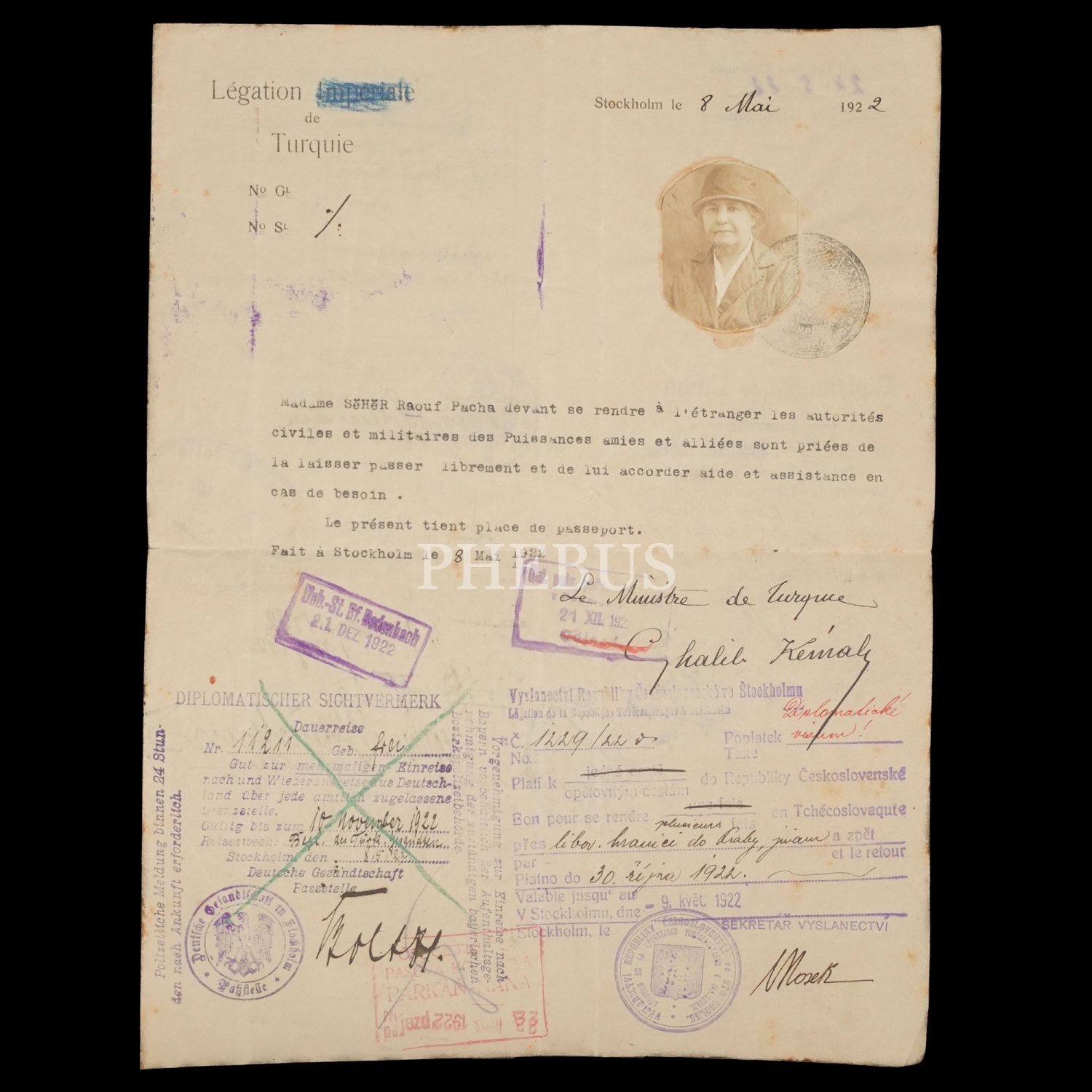 Stockholm Elçisi Galip Kemali Söylemezğlu tarafından Rauf Paşa´nın eşi Seher Hanım adına hazırlanan, 8 Mayıs 1922 tarihli ve Galip Kemali Bey´den ıslak imzalı pasaport, 23x30 cm...