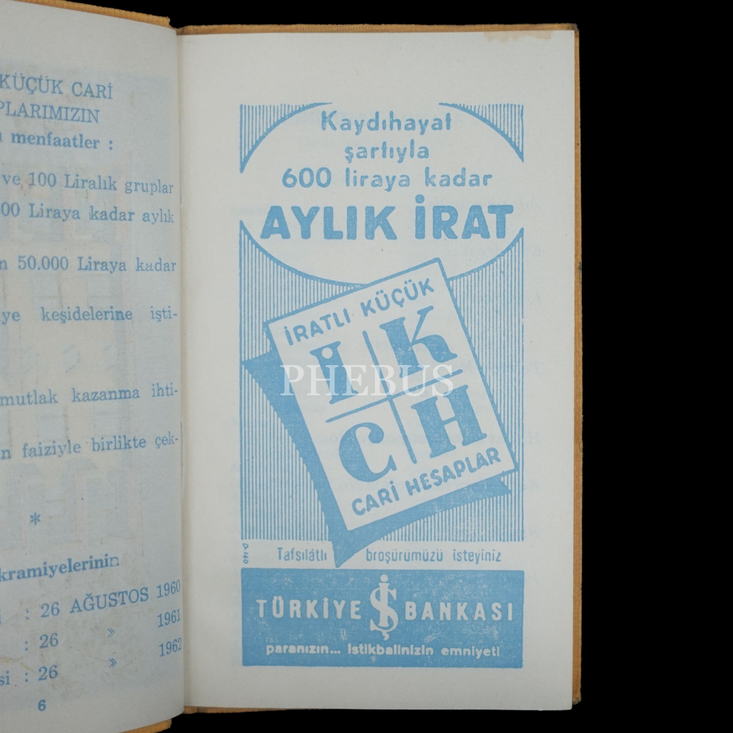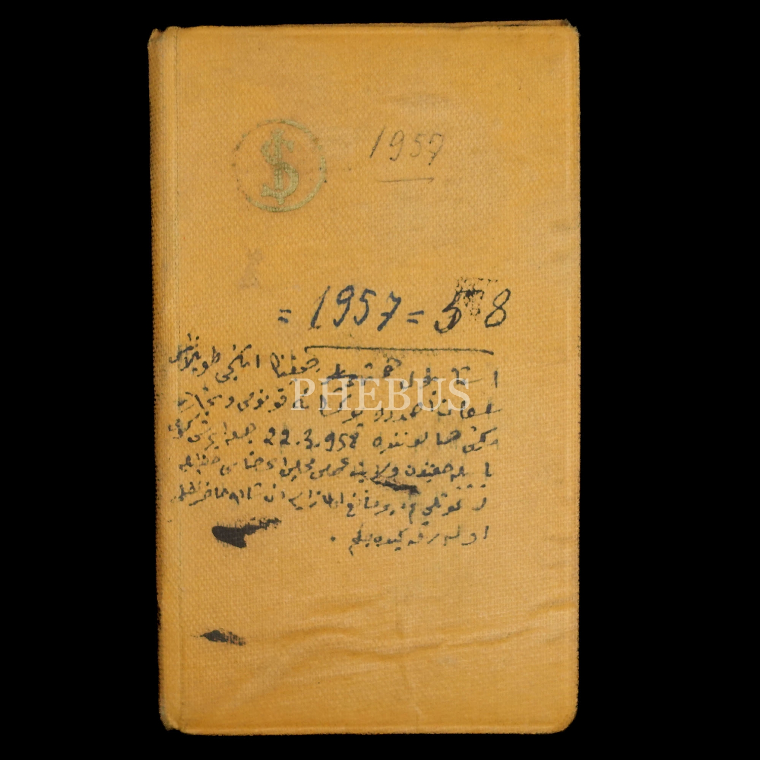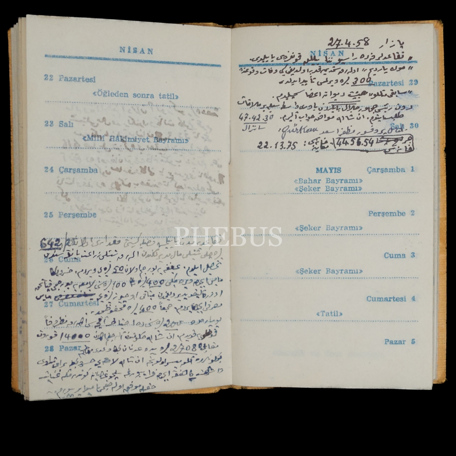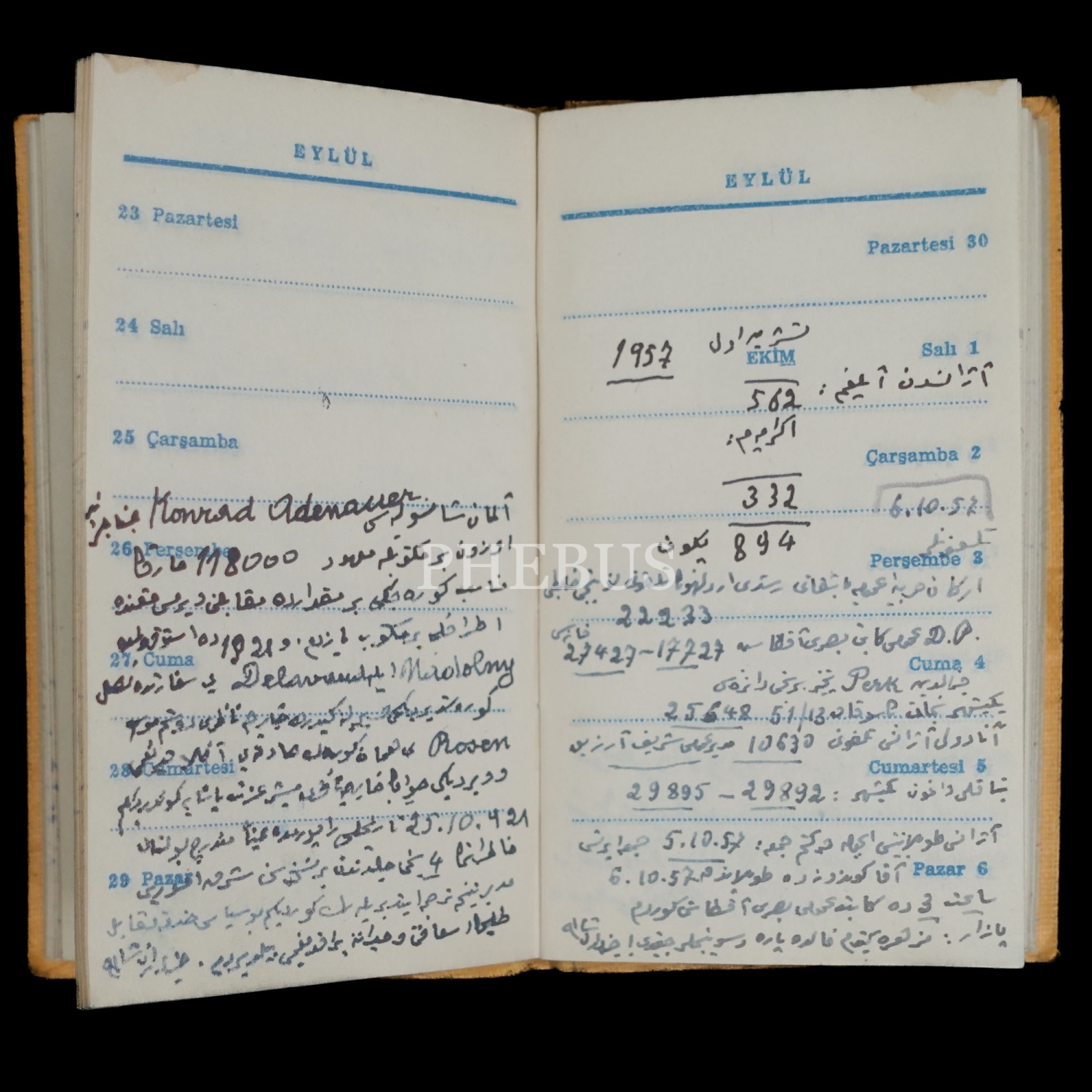 Hüsrev Gerede´nin iş ve aile hayatına dair eski harflerle günlük notlar tuttuğu Türkiye İş Bankası 1957 Ajandası, 1957-1958, 7x11 cm...
