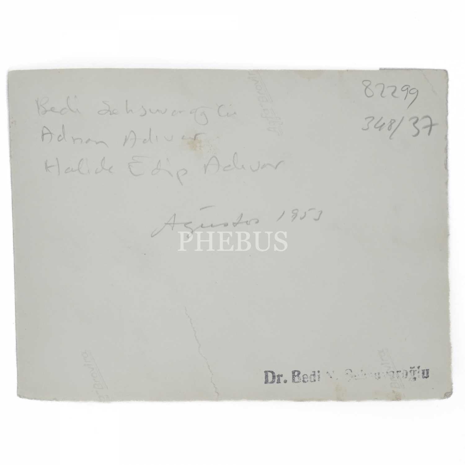 Halide Edip Adıvar ve Adnan Adıvar çiftinin, Süheyl Ünver ile aldırdıkları hatıra fotoğrafı, Ağustos 1953, 12x9 cm...