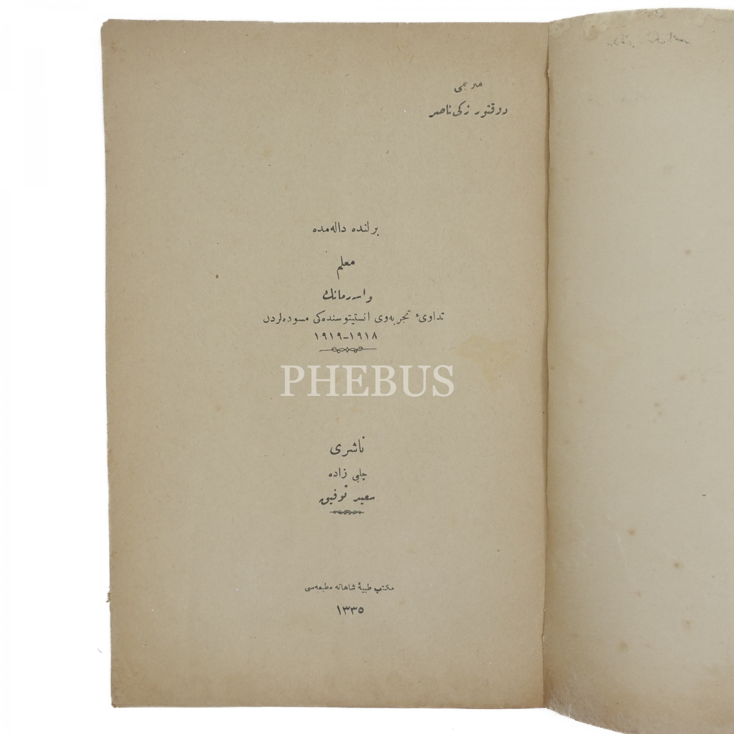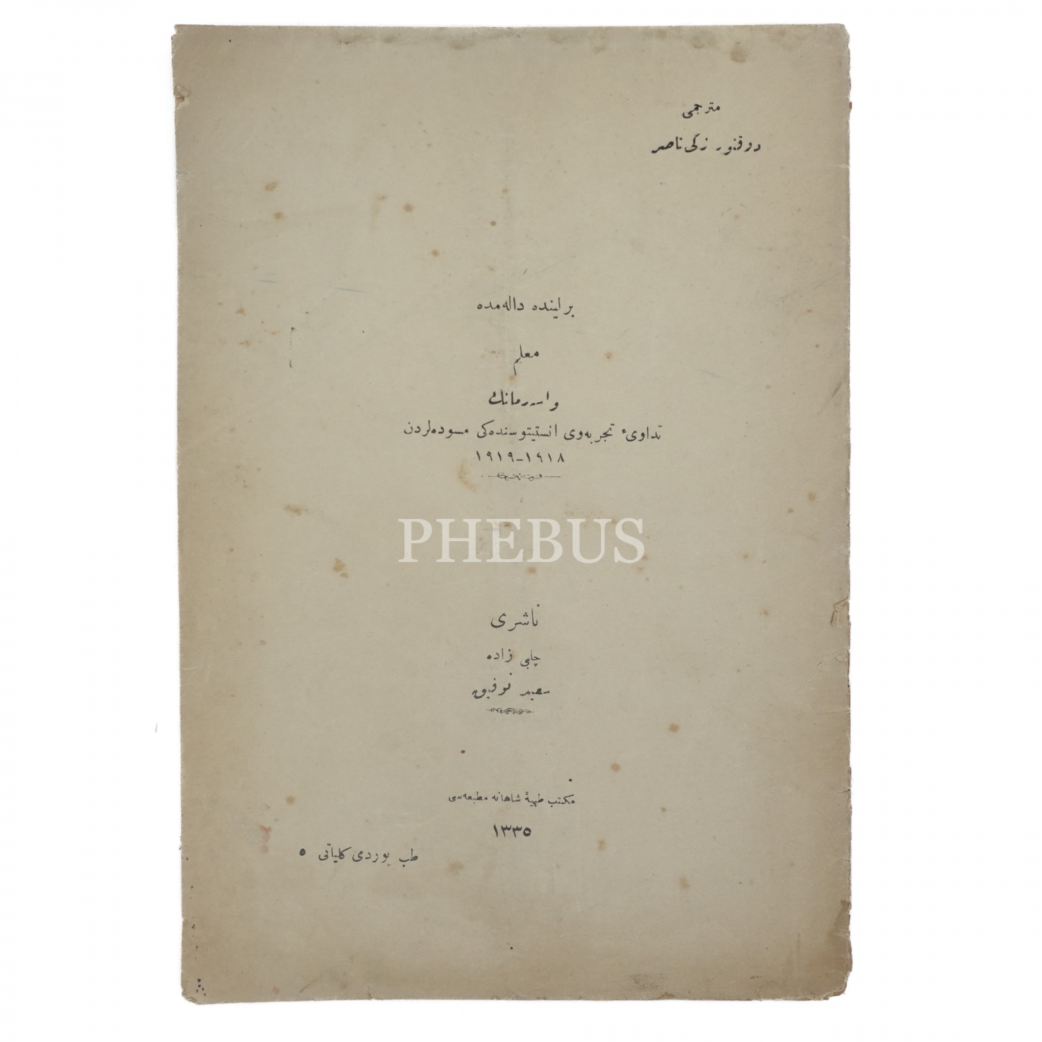 WASSWERMANN´IN TEDAVİ-İ TECRÜBEVÎ ENSTİTÜSÜNDEKİ MÜSVEDDELERİNDEN 1918-1919, (Çeviren: Doktor Zeki Nasır), 1330, Mekteb-i Tıbbiye-i Şahane Matbaası, 24 sayfa, 20x14 cm...
