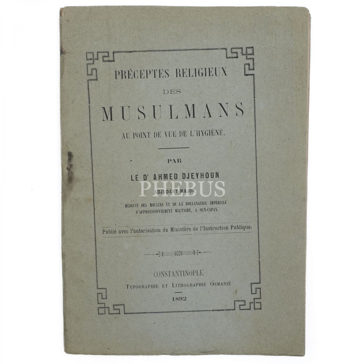 PRECEPTES RELIGIEUX DES MUSULMANS AU POINT DE VUE DE L´HYGIENE, Ahmed Djeyhoun, 1892, İstanbul, Fransızca, 72 sayfa, 19x13 cm...