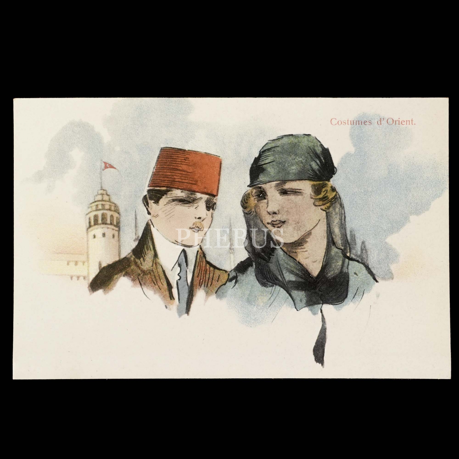 "Galata Kulesi ve iki âşık" temalı kartpostal, "Costumes d´Orient" (Oryanyal kostümler), 14x9 cm...