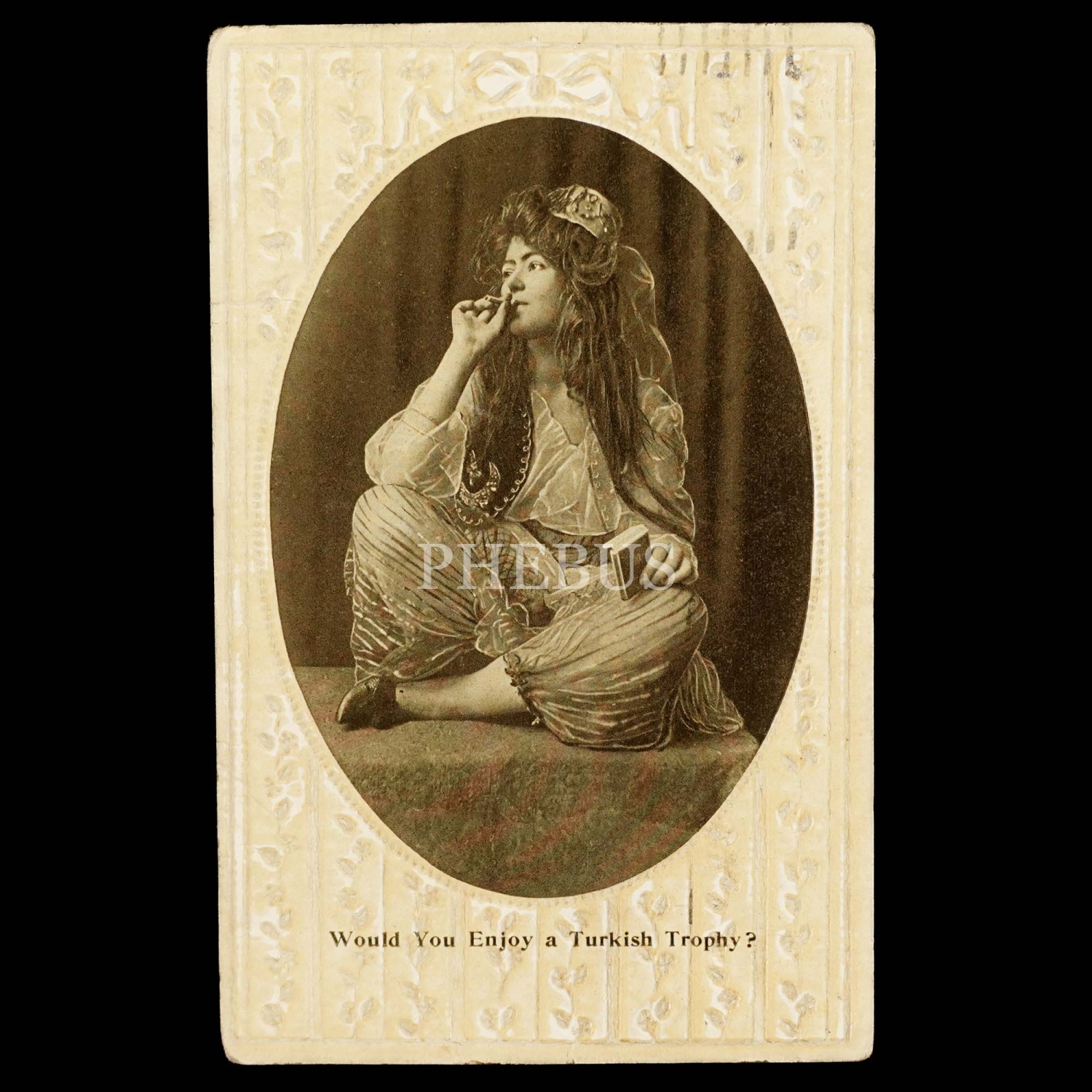 Sigara içen Türk kadını görselli ve "Would You Enjoy a Turkish Trophy?" yazılı, gofre çerçeveli kartpostal, 9x14 cm...