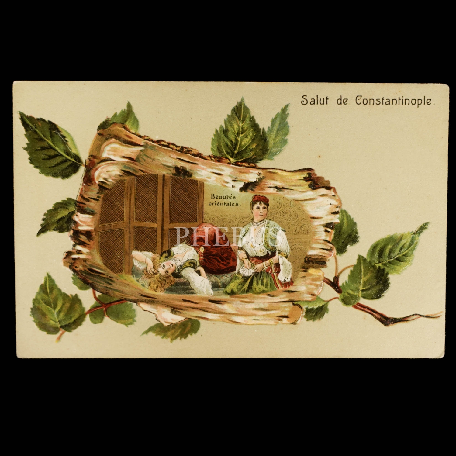 Türk kadınları görselli gofre fantazi kartpostal, "Salut de Constantinople - Beautes orientales", 14x9 cm...