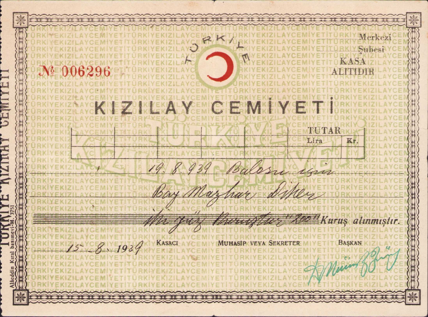 Kızılay Cemiyeti makbuz, 1939, 18x12 cm
