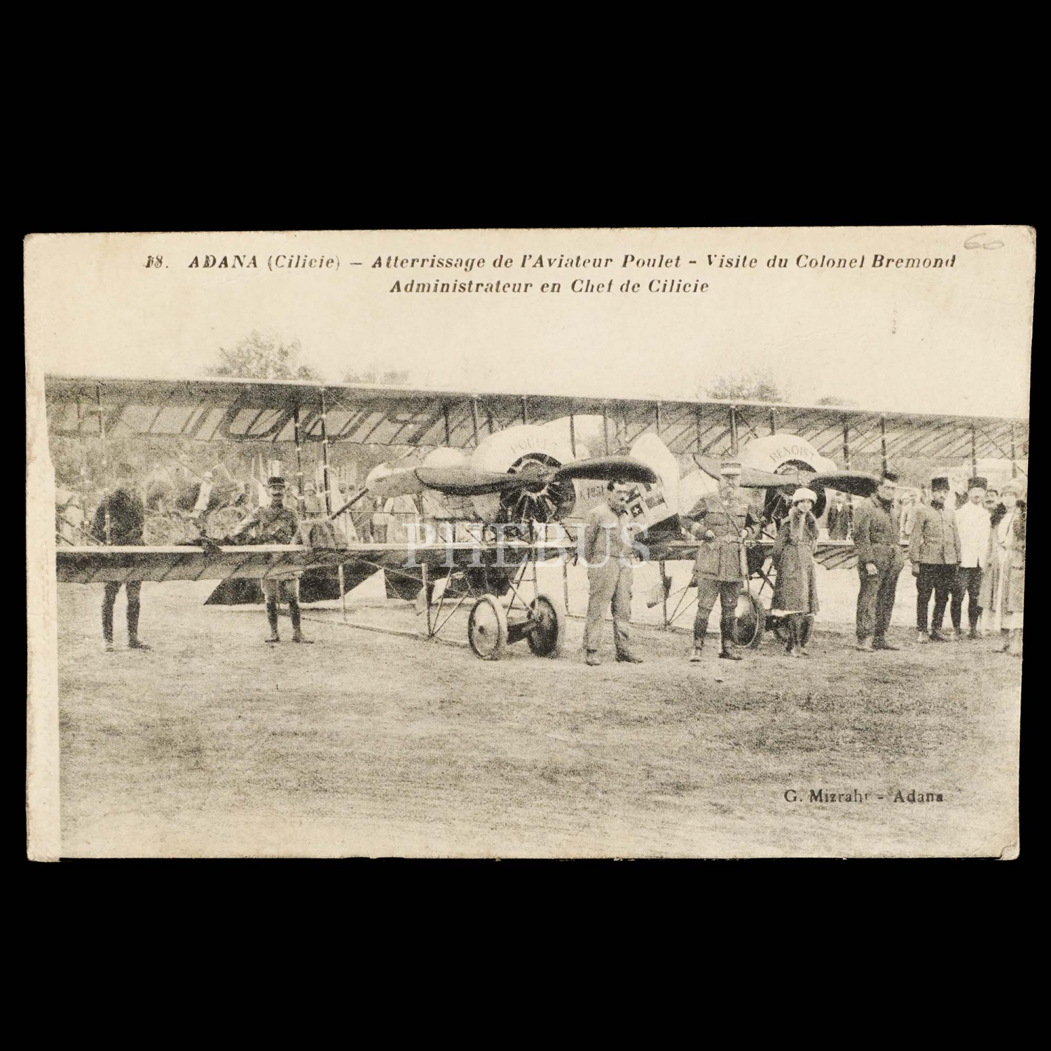Adana işgal komutanı Bremond´un katılımıyla düzenlenen tayyare uçusundan bir hatıra, "Adana - Atterrissage de l´Aviateur Poulet - Visite du Colonel Bremond - Administrateur en Chef de Cilicie", ed. G. Mizrahi (Adana), 14x9 cm...