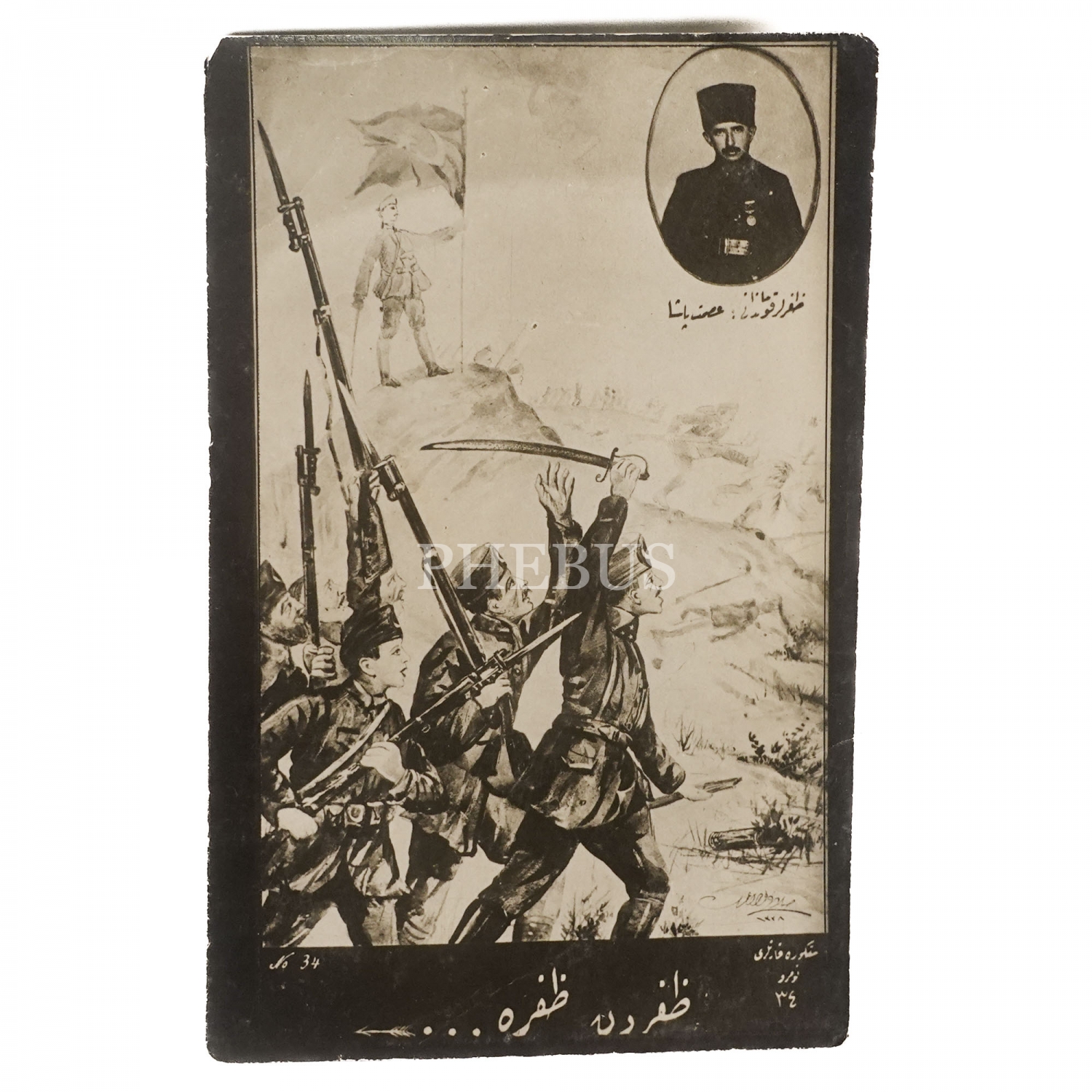 "Zaferler Kumandanı: İsmet (İnönü) Paşa" alt başlığıyla İsmet İnönü´nün portresine ve Milli Mücadele´de zafer elde etmiş Türk askerlerinin illüstre edildiği mefkure kartı, 14x9 cm...