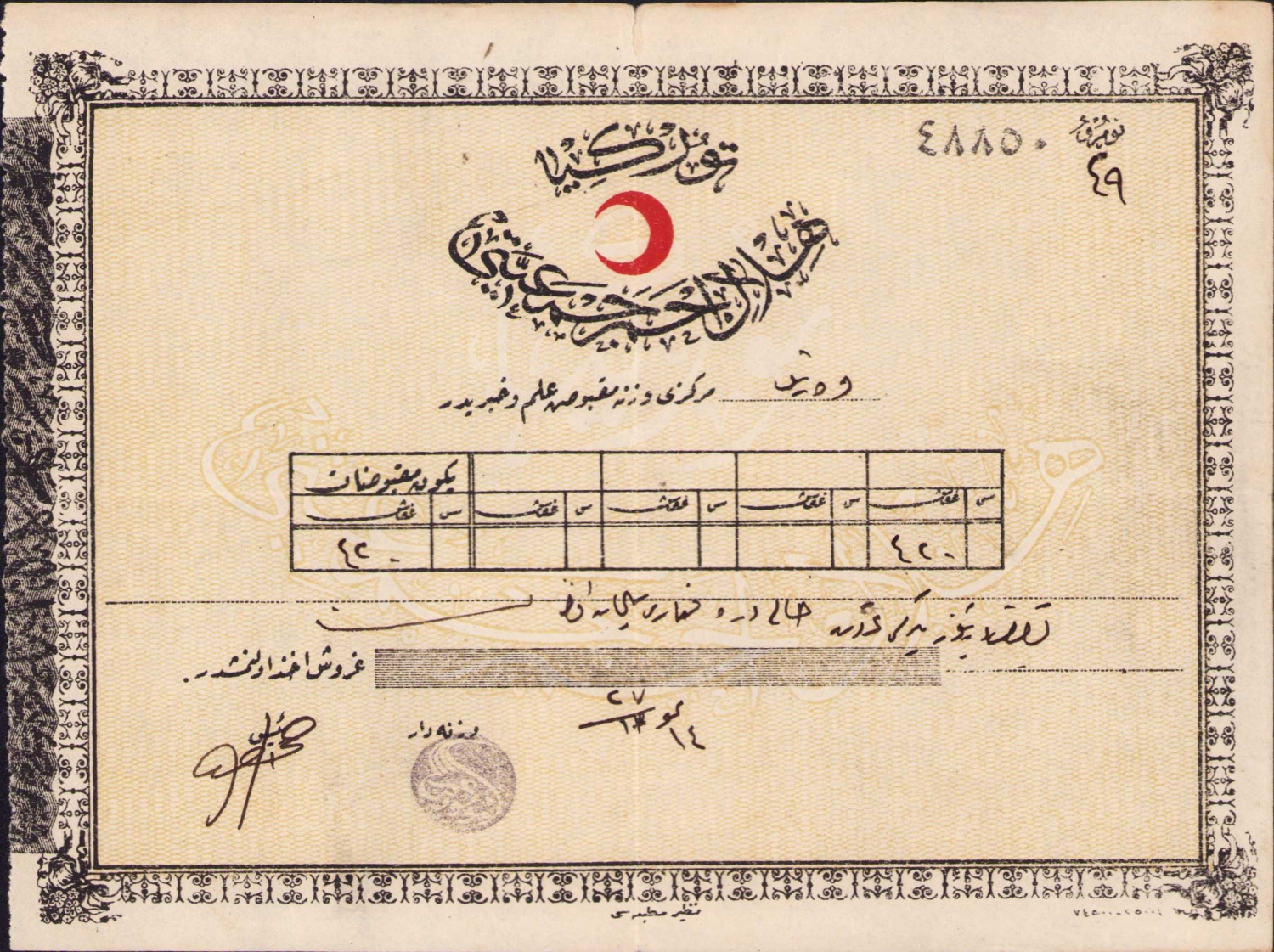 Osmanlıca Hilal-i Ahmer Cemiyeti makbuz ilmühaberi, 18x12 cm
