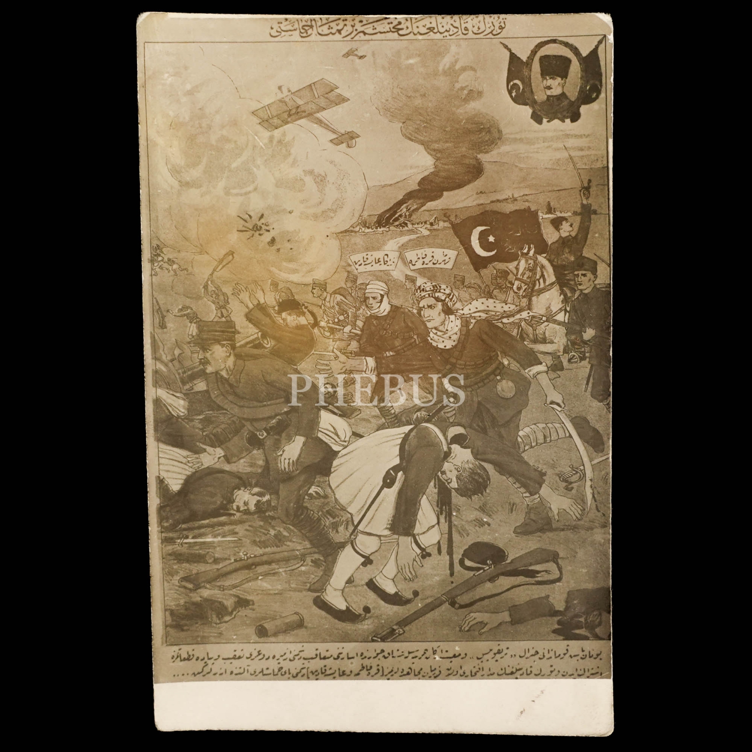Mustafa Kemal Atatatürk´ün ve Milli Mücadele´nin kadın kahramanlarından Kara Fatma ve Ayşe Kadın´ın düşman kuvvetleri ile savaşırken resmedildiği mefkure kartı, ed. Masterakis Freres, Constantinople, 14x9 cm..