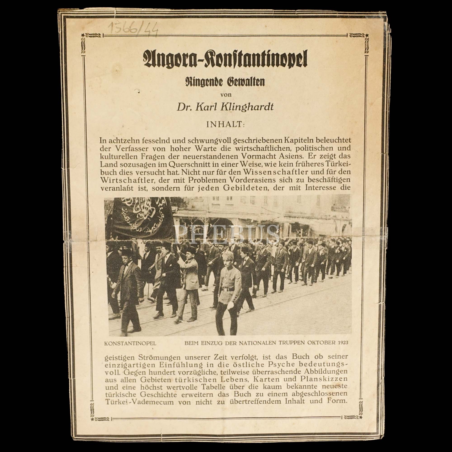 Karl Klinghardt tarafından kaleme alınan ANGORA - KONSTANTINOPEL adlı kitabın, Mustafa Kemal Atatürk görselli el ilanı, 19x25 cm...