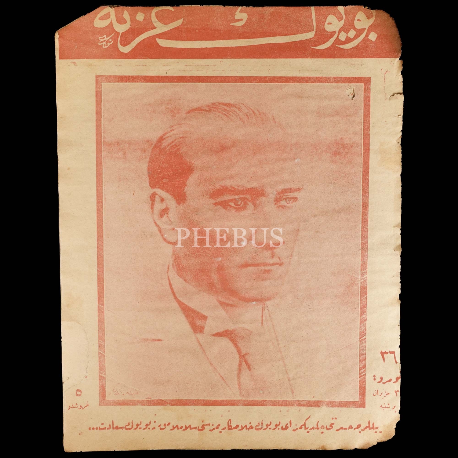 "Yıllarca hasretini çekdiğimiz ey büyük halaskarımız seni selamlamak ne büyük saadet..." alt başlığıyla kapağına Mustafa Kemal Atatürk´ün fotoğrafına yer veren BÜYÜK GAZETE´nin 36. sayısı, 23x30 cm...
